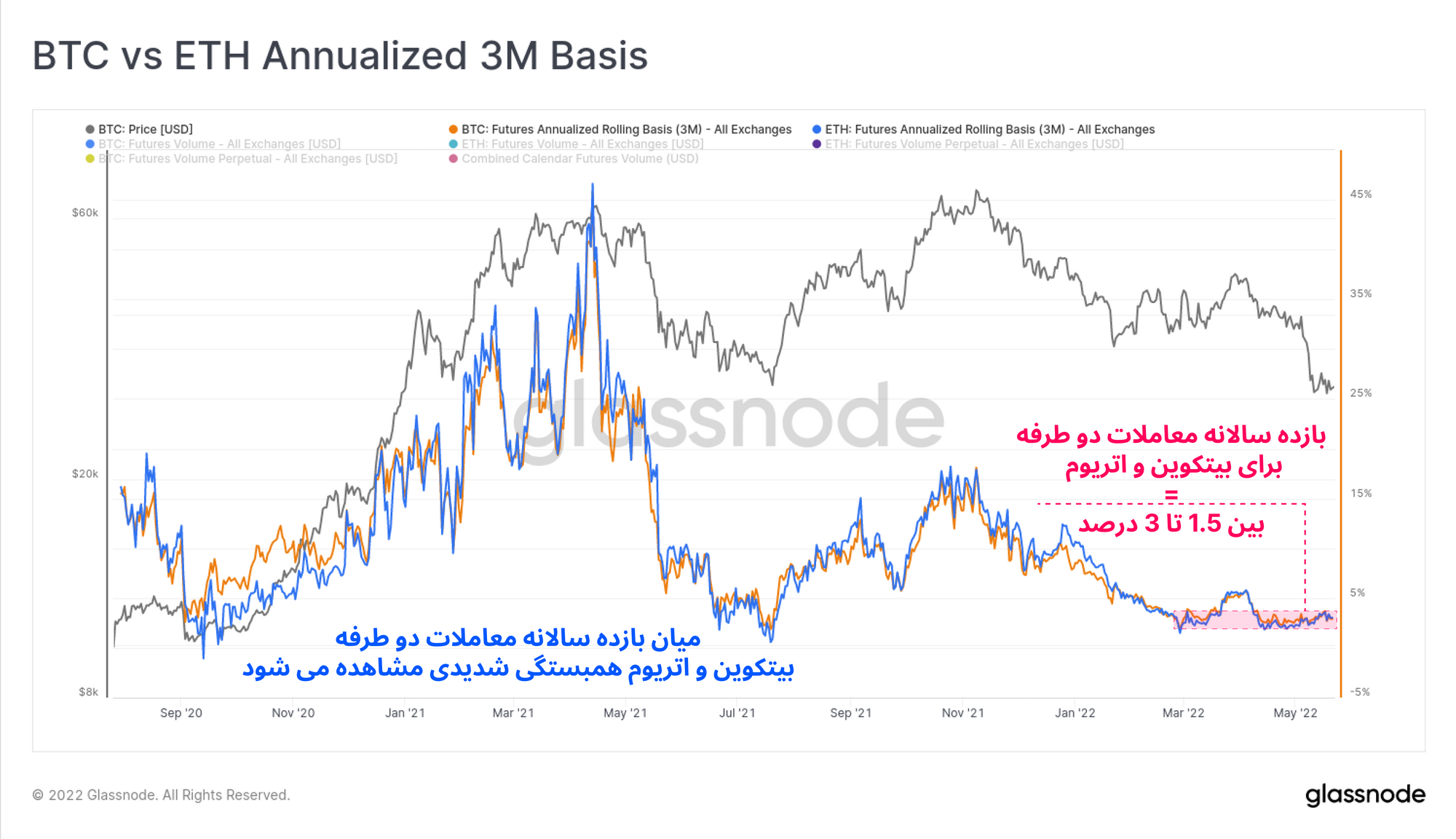 در بازار مشتقات نیز میان اتریوم و بیتکوین همبستگی مشاهده می کنیم. این بار، این همبستگی در معاملات دو طرفه فیوچرز مشاهده می شود.