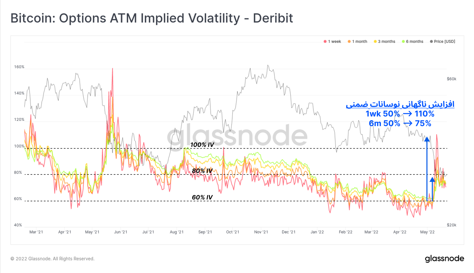 نمودار زیر نوسانی که بر اساس معاملات آپشن برای بازار پیشبینیشده باشد، نمایش میدهد. طبق تصویر پایین، در ۳ تا ۶ ماه آینده احتمال کاهش بیشتر قیمت وجود دارد و در سقوط قیمتی هفته پیش، نوسان شدیدی برای بازار پیشبینی شده بود. نوسان پیشبینی شده برای قراردادهای آپشن کوتاهمدت، از ۵۰ درصد تا ۱۱۰ افزایش پیدا کرد و در همین حال، نوسان پیشبینی شده برای قراردادهای بلندمدت ششماهه آپشن، تنها تا ۷۵ درصد افزایش پیدا کردند. بعد از میزان نوسان کمی که در این مدت برای بازار پیش بینی شده،اخیرامیزان نوسان نسبت به دفعات قبل به طور ناگهانی شدت پیدا کرد.