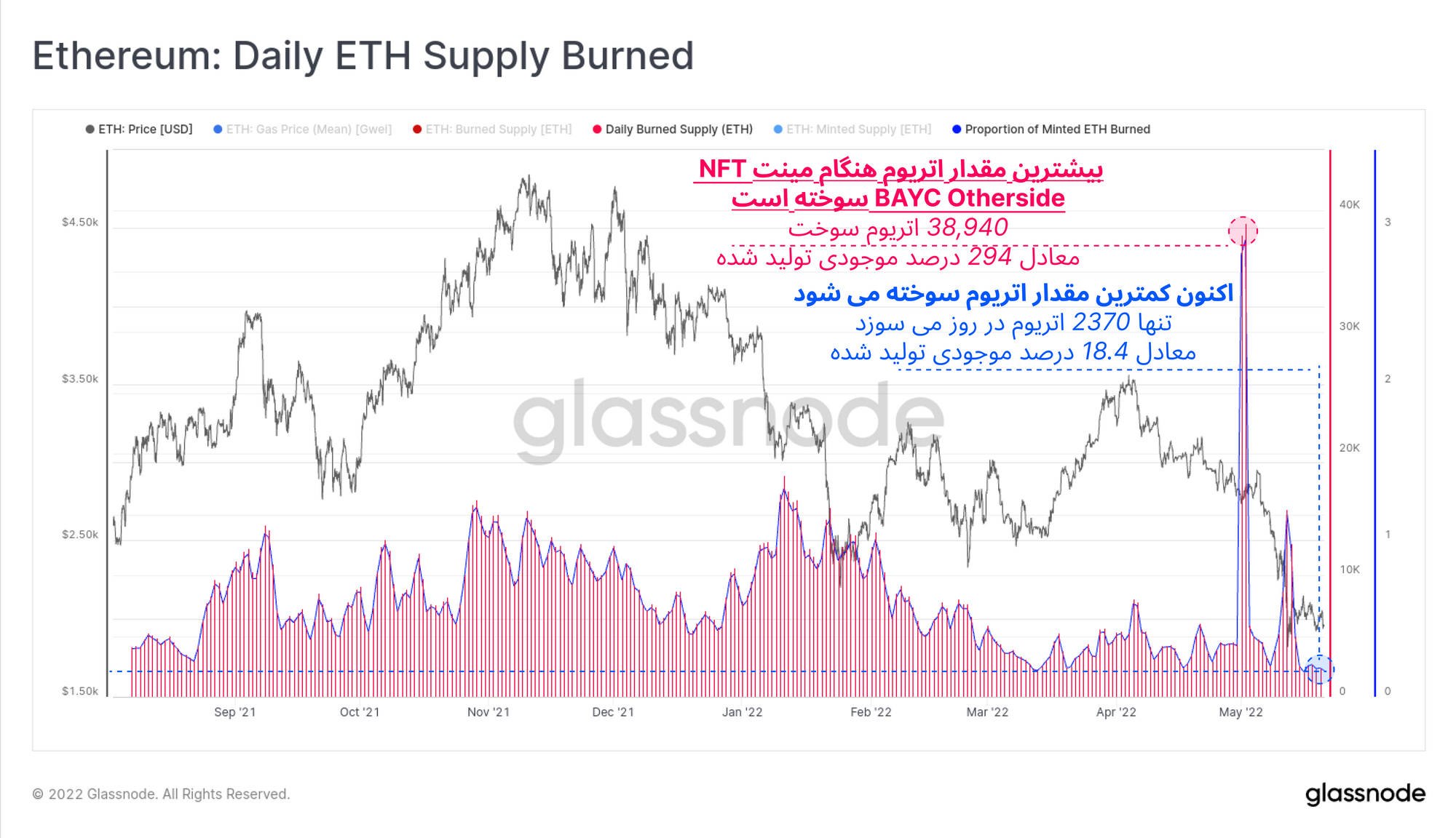 سوزانده شدن اتریومها بهوسیله پروتکل EIP559، علت دیگری برای کاهش تقاضا فضای بلاک اتریوم است. هنگام مینت کالکشن the Bored Ape Yacht Club، در یک روز ۳۸,۹۴۰ اتریوم سوزانده شد که این بیشترین میزان سوخته شدن اتریوم بوده است. اما اکنون میزان سوزانده شدن اتریوم در پایینترین مقدار خود به سر میبرد.