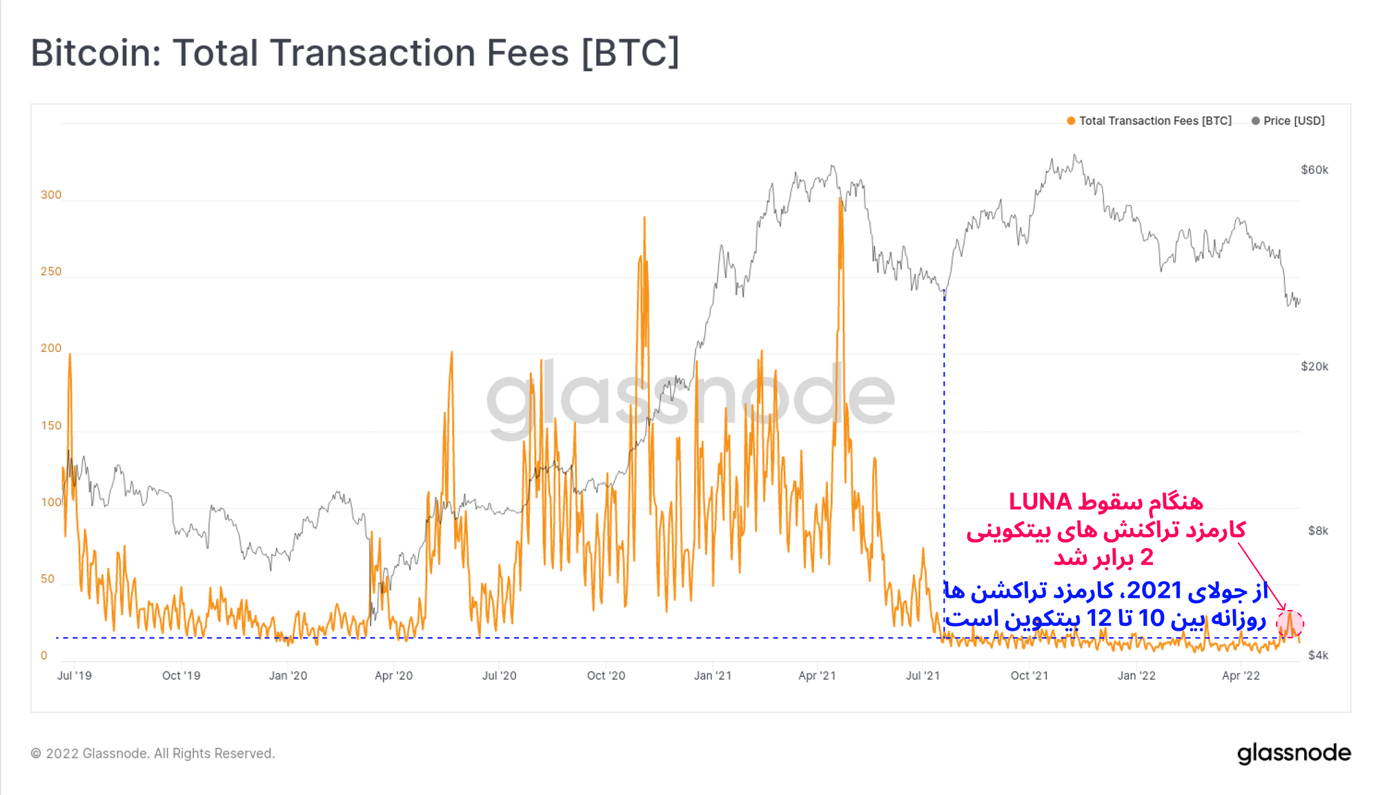 با وجود اینکه در دو هفته اخیر کل کارمزدی که به صورت بیتکوین به ماینرها پرداخت می شود ۲ برابر شد، اما میزان کارمزدها از می ۲۰۲۱ همچنان بین ۱۰ تا ۱۲ بیتکوین است.