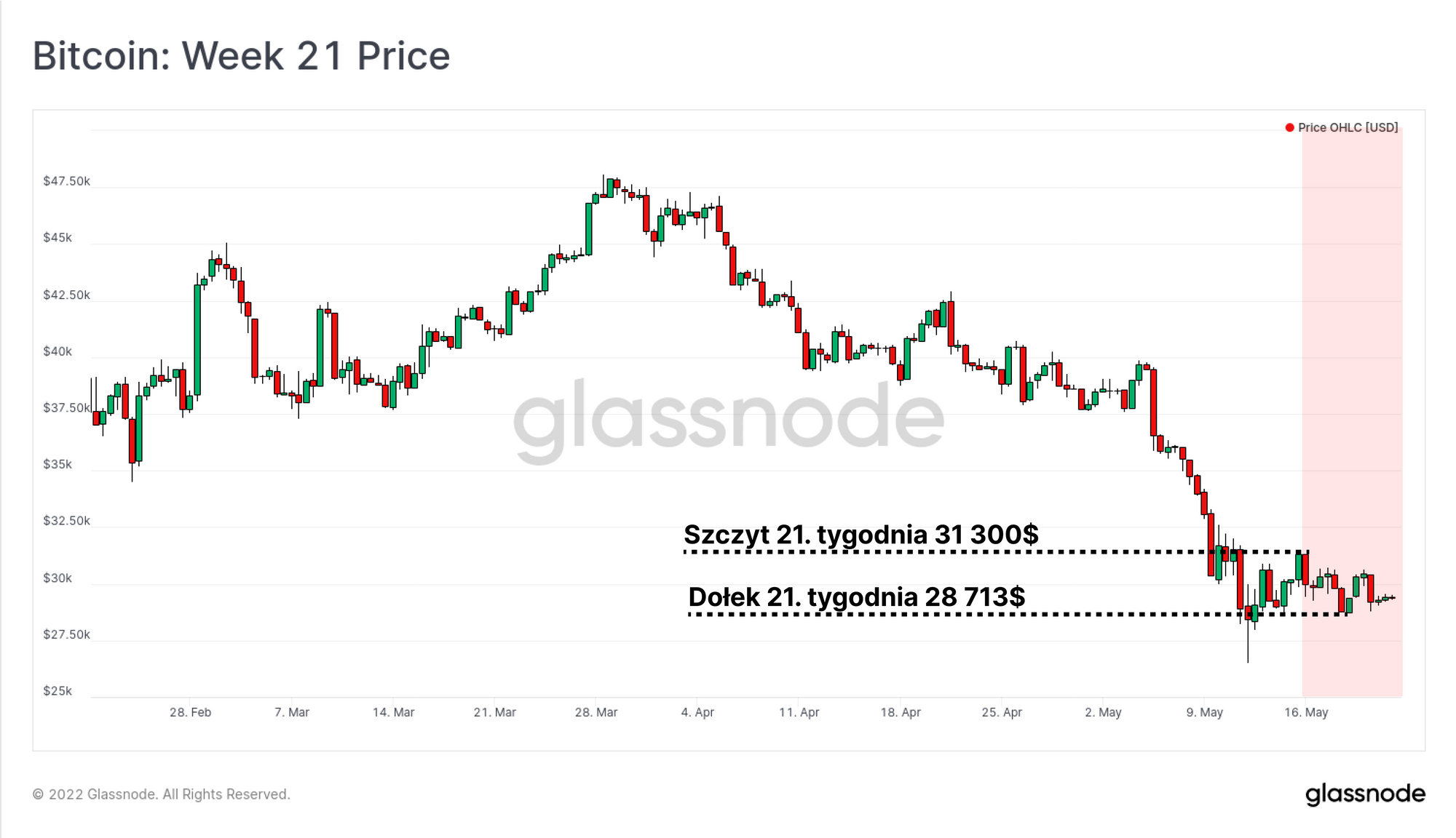 Po wyprzedaży obejmującej całą branżę oraz po upadku LUNY i UST w zeszłym tygodniu, rynki weszły w okres konsolidacji cenowej. Notowania Bitcoina poruszały się w stosunkowo wąskim zakresie, ze szczytem w okolicach 31 300$ oraz dołkiem na poziomie 28 713$.