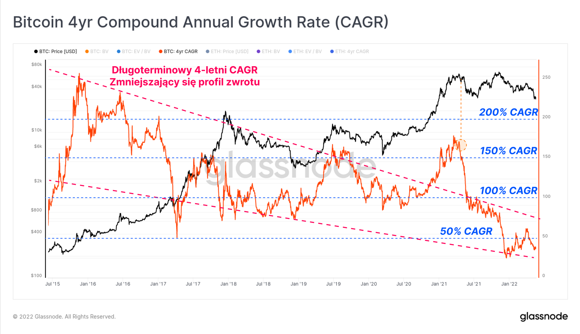 Możemy w ten sposób przedstawić długoterminową kompresję zwrotów, w której to CAGR spadł z ponad 200% w 2015 roku do mniej niż 50% obecnie. W szczególności zaobserwować można wyraźny spadek 4-letniego średniego wskaźnika zwrotu tuż po spadkach z maja 2021 roku, które jak argumentowaliśmy, były prawdopodobnie początkiem bessy.
