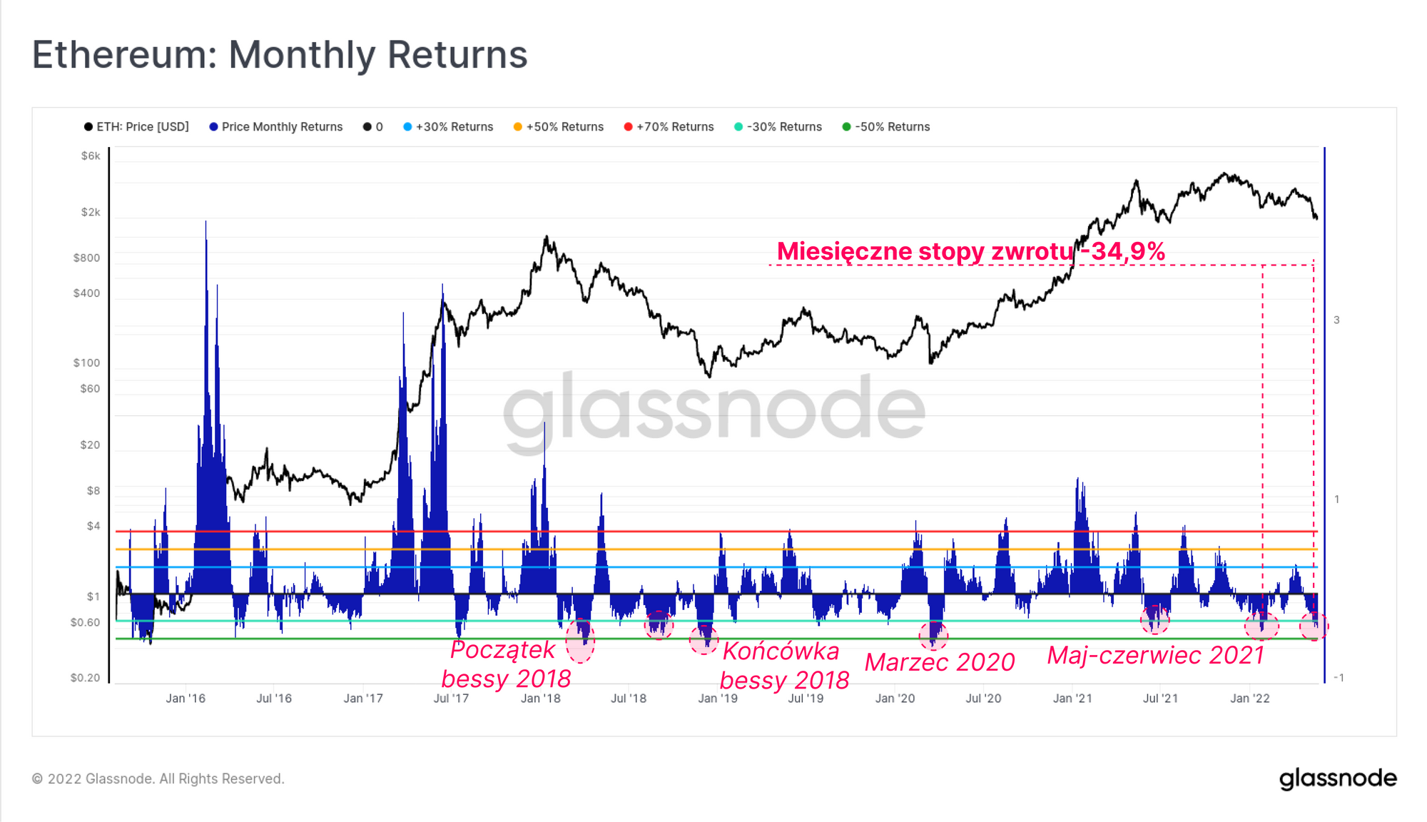Bardzo podobny profil zwrotu widzimy w ostatnich miesiącach w przypadku Ethereum, jednakże ze stosunkowo gorszym wynikiem -34,9%. Pokazuje to, iż korelacja kursów tych dwóch aktywów pozostaje silna, mimo ogromnej liczby różnic w fundamentach.