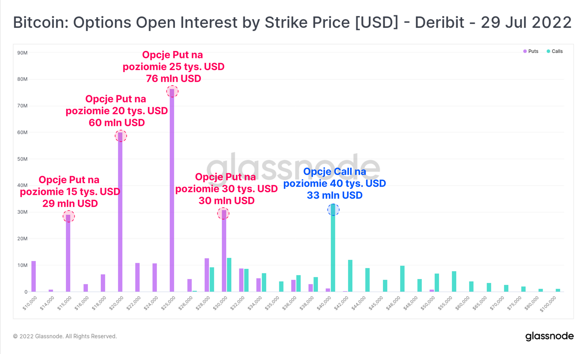 Spoglądając na koniec 2 kwartału, widzimy ogromną przewagę opcji Put, z kluczowymi poziomami 25 tys. USD, 20 tys. USD oraz 15 tys. USD. Pula otwartych opcji Call jest znacznie niższa, a otwarte kontrakty koncentrują się głównie wokół poziomu 40 000$.