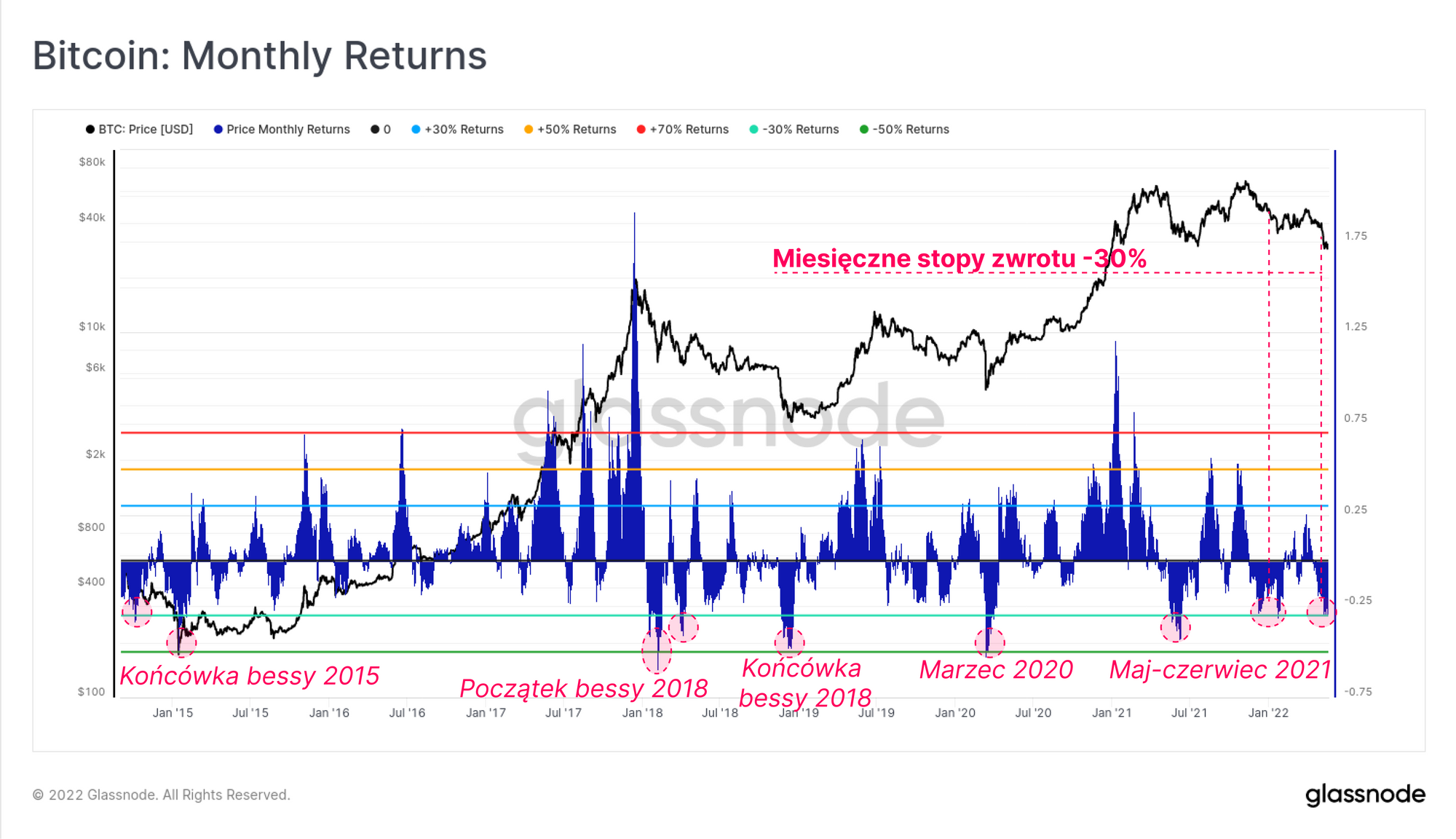 W perspektywie krótkoterminowej zauważyć możemy, że również profil miesięcznych zwrotów z inwestycji w Bitcoina był rozczarowujący, z ujemną wartością osiągającą -30%. Efektem tego jest fakt, że w ciągu ostatniego miesiąca Bitcoin każdego dnia tracił średnio 1% swojej wartości rynkowej.