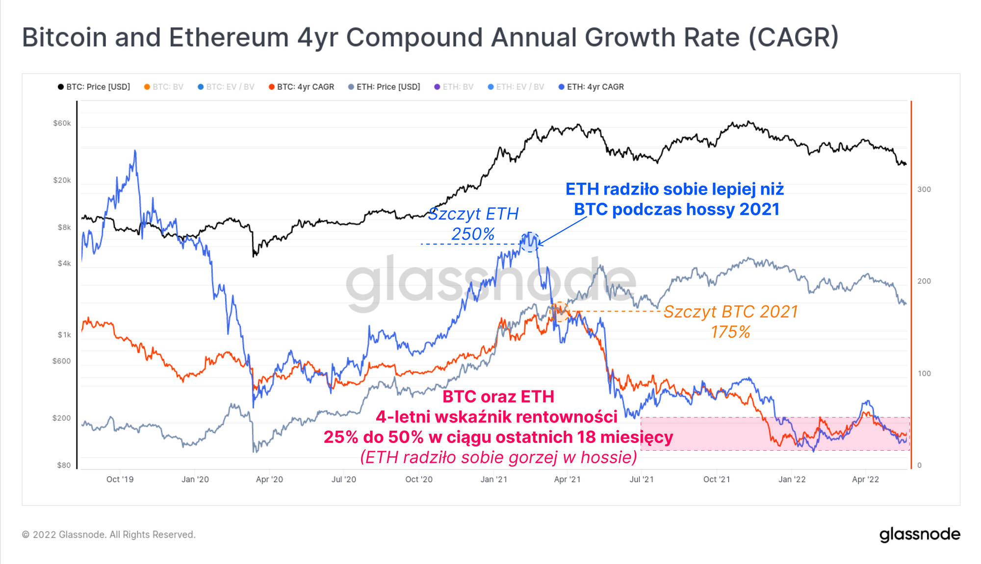 W ciągu ostatnich 12 miesięcy 4-letni wskaźnik rentowności obydwu aktyw zmniejszył się z około 100%/rok do jedynie 36%/rok w przypadku BTC oraz 28%/rok dla ETH, podkreślając surowość tej bessy.