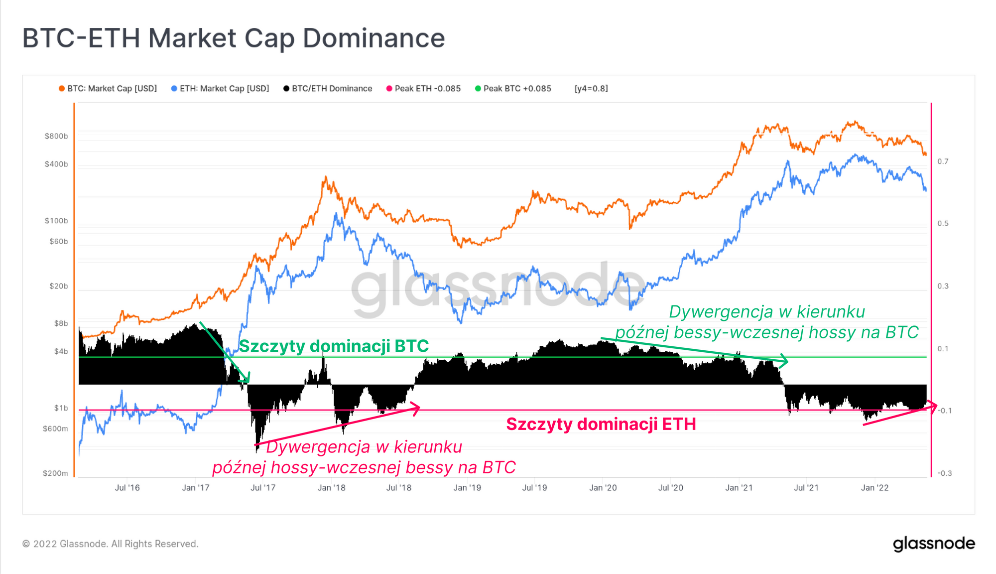 W obecnych realiach rynkowych oraz po rekordzie notowań (ATH) w listopadzie zauważamy rozwijającą się dywergencję na korzyść dominacji BTC. Mając na uwadze negatywne nastawienie do bardziej ryzykownych aktywów spowodowane upadkiem LUNY oraz UST, trend ten może być warty obserwowania. Warto tutaj zauważyć, że porównując obecną sytuację do bessy w 2018 roku, dominacja Ethereum utrzymuje się na wysokim poziomie od dłuższego czasu, co sugeruje zwiększające się docenienie ETH wraz z upływem lat i rozwojem projektu.