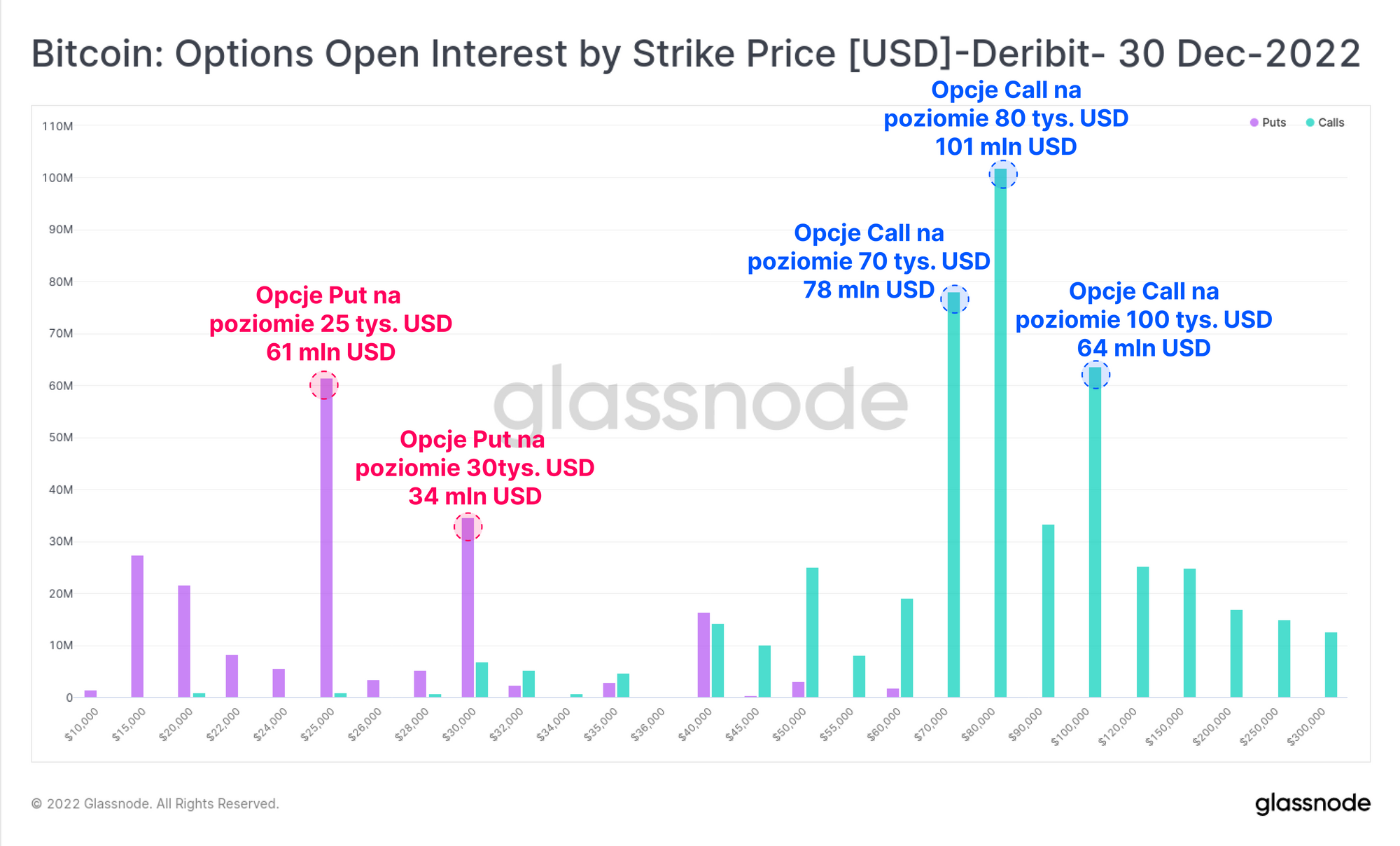 Jednakże w dłuższej perspektywie, otwarte kontrakty na koniec roku są zauważalnie bardziej konstruktywne. Widoczna jest preferencja opcji Call, z koncentracją kontraktów na poziomach od 70 tys. USD do 100 tys. USD. Co więcej, dominująca ilość opcji Put znajduje się na poziomach 25 tys. USD oraz 30 tys. USD, co daje nam poziomy wyższe niż w przypadku opcji w połowie roku.