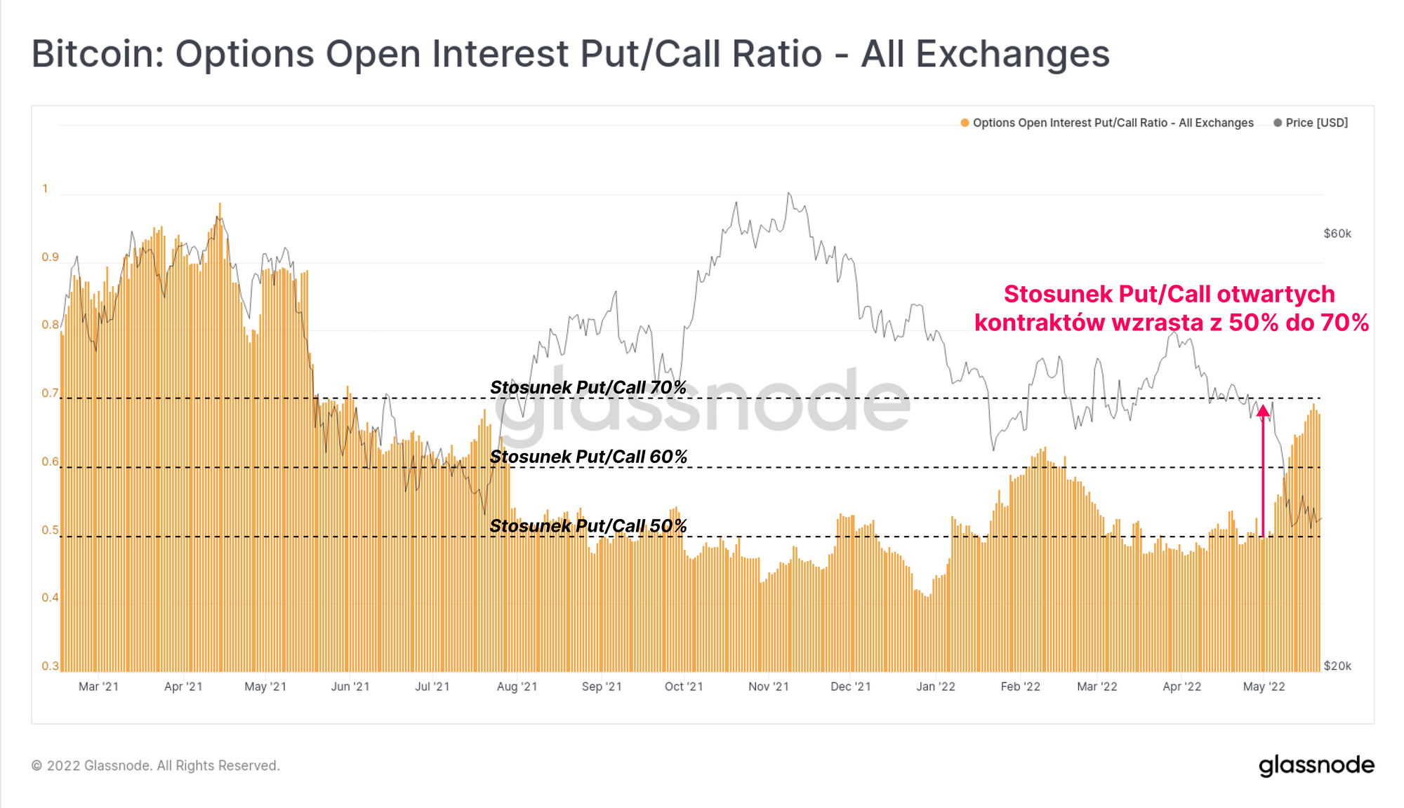 W obliczu tak silnej bessy i tak słabych notowań nie powinno być niespodzianką, że rynek wyraźnie preferuje opcje Put (sprzedaży). Wraz z rynkowymi staraniami, aby zabezpieczyć się przed dalszymi spadkami, w ciągu ostatnich dwóch tygodni stosunek opcji Put/Call dla otwartych kontraktów wzrósł z 50% do 70%.