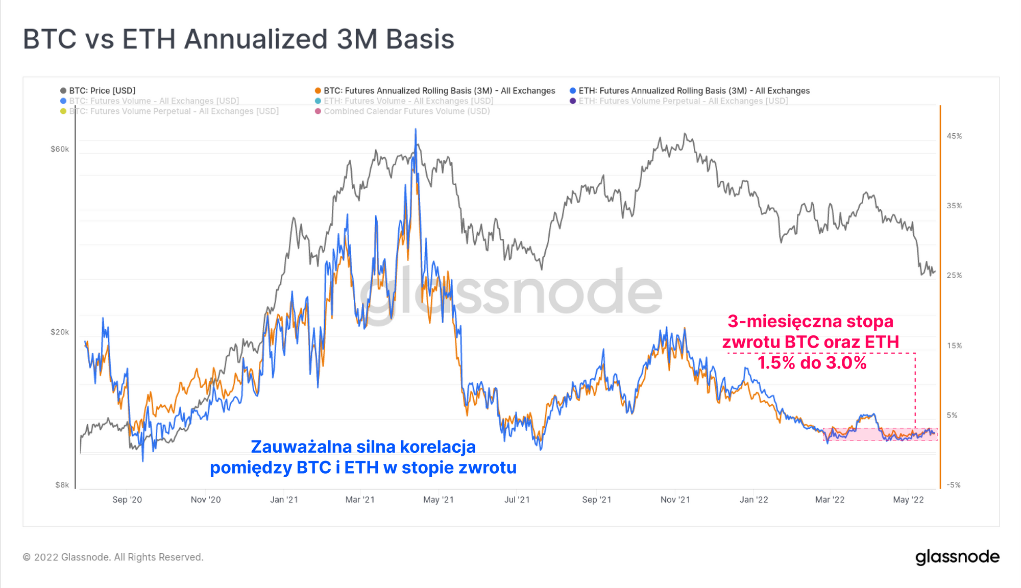 Przechodząc do rynków instrumentów pochodnych, widzimy istnienie kolejnej zależności między BTC a ETH - tym razem w stopie zwrotu z arbitrażu cash-and-carry (zakupu aktywów na rynku i zachowaniu ich aż do momentu, kiedy wykona się kontrakt futures). W całym cyklu lat 2020-2022 na obu aktywach uzyskiwano praktycznie identyczną stopę zwrotu w ujęciu 3-miesięcznym, z bardzo nielicznymi okresami rozbieżności. Jest to kolejny fakt sugerujący, że traderzy wykorzystują każdą możliwą okazję, która pojawia się na rynku, o ile oczywiście pozwala na to płynność i wolumen.