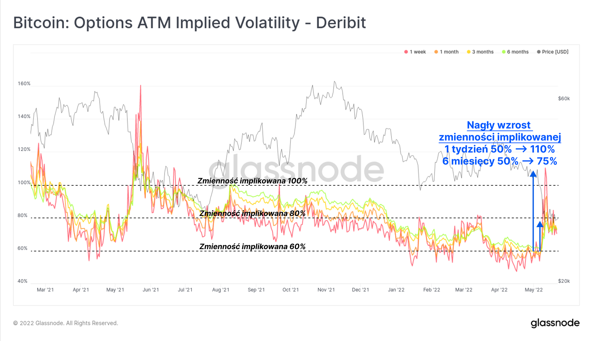 Przechodząc dalej, wyceny na rynku kontraktów opcyjnych na najbliższą przyszłość są nadal pełne niepewności oraz możliwości dalszych spadków, szczególnie w ciągu najbliższych trzech do sześciu miesięcy. Implikowana zmienność gwałtownie wzrosła podczas krachu z zeszłego tygodnia. Opcje krótkoterminowe zanotowały ponad dwukrotny wzrost implikowanej zmienności, z 50% do 110%, podczas gdy 6-miesięczne opcje implikowanej zmienności podskoczyły do 75%. Jest to przełamanie długotrwałych niskich poziomów implikowanej zmienności.