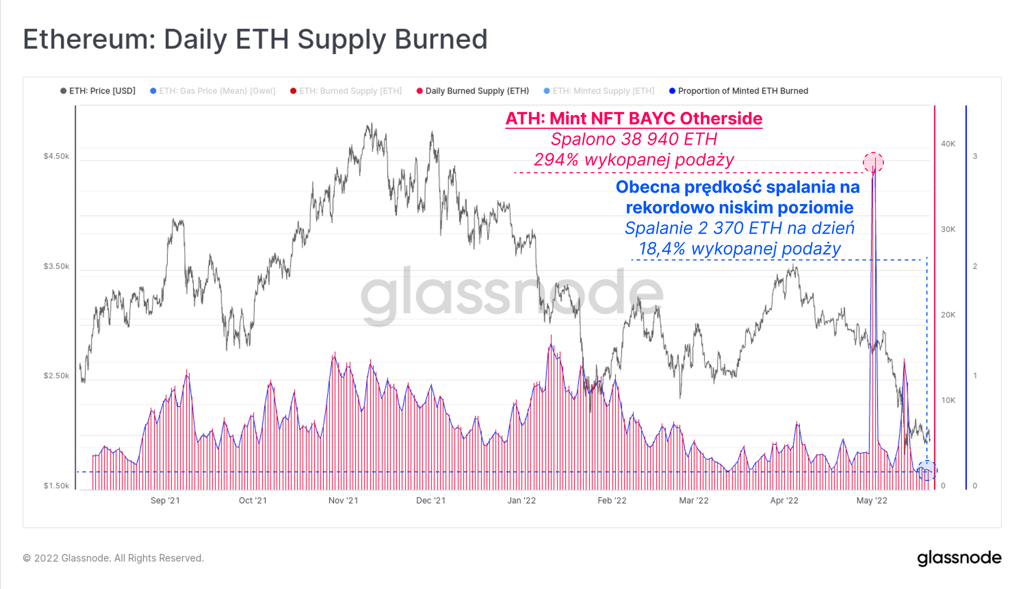 Zgodnie z efektem domina, mniejsze zapotrzebowanie na przestrzeń blokową Ethereum powoduje mniejszą ilość coinów ETH spalanych dzięki implementacji protokołu EIP-1559. Po osiągnięciu rekordu w ilości spalanych coinów na poziomie 38 940 ETH/dzień podczas mintu NFT Bored Ape Yacht Club „Otherside”, prędkość spalania spadła i znajduje się obecnie na rekordowo niskim poziomie.