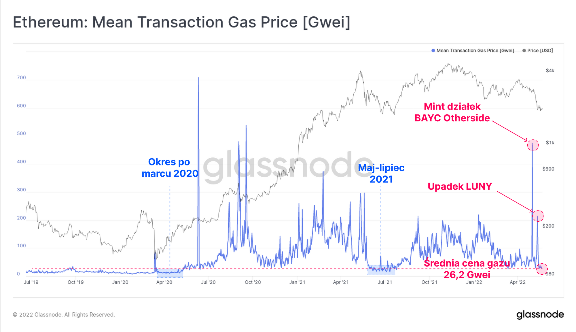 Z wyjątkami w postaci mintu niezwykle popularnych NFT oraz wyprzedaży w zeszłym tygodniu, od grudnia ceny gazu na sieci Ethereum znajdują się w długotrwałym trendzie spadkowym. Tak niskie średnie ceny gazu kojarzone mogą być z dołkami z okresu maja-lipca 2021 roku oraz z okresem niepewności po spadkach w marcu 2020 roku.
