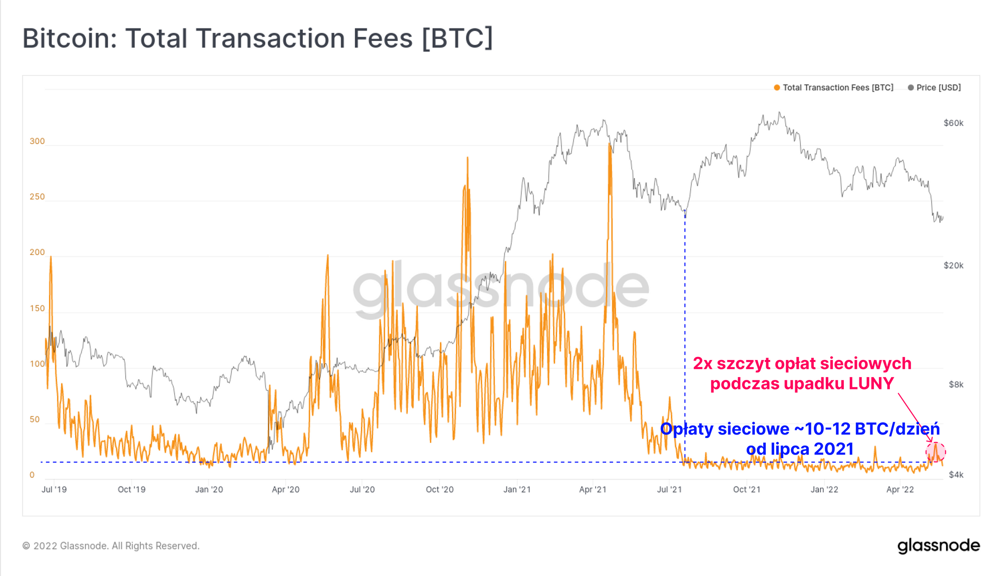Być może w silnej zależności z krótkoterminowym strachem na rynkach instrumentów pochodnych pozostaje nieimponująca aktywność na sieci zarówno Bitcoina jak i Ethereum. Generalnie wysoki popyt na przestrzeń blokową oraz wykorzystanie sieci objawia się jej przeciążeniem i wzrostem opłat transakcyjnych. Mimo, iż widzieliśmy dwukrotnie wzrost zsumowanych opłat sieciowych podczas sporej zmienności cenowej w ostatnim tygodniu, to od maja 2021 roku suma tych opłat utrzymuje się na poziomie około 10-12 BTC na dzień.