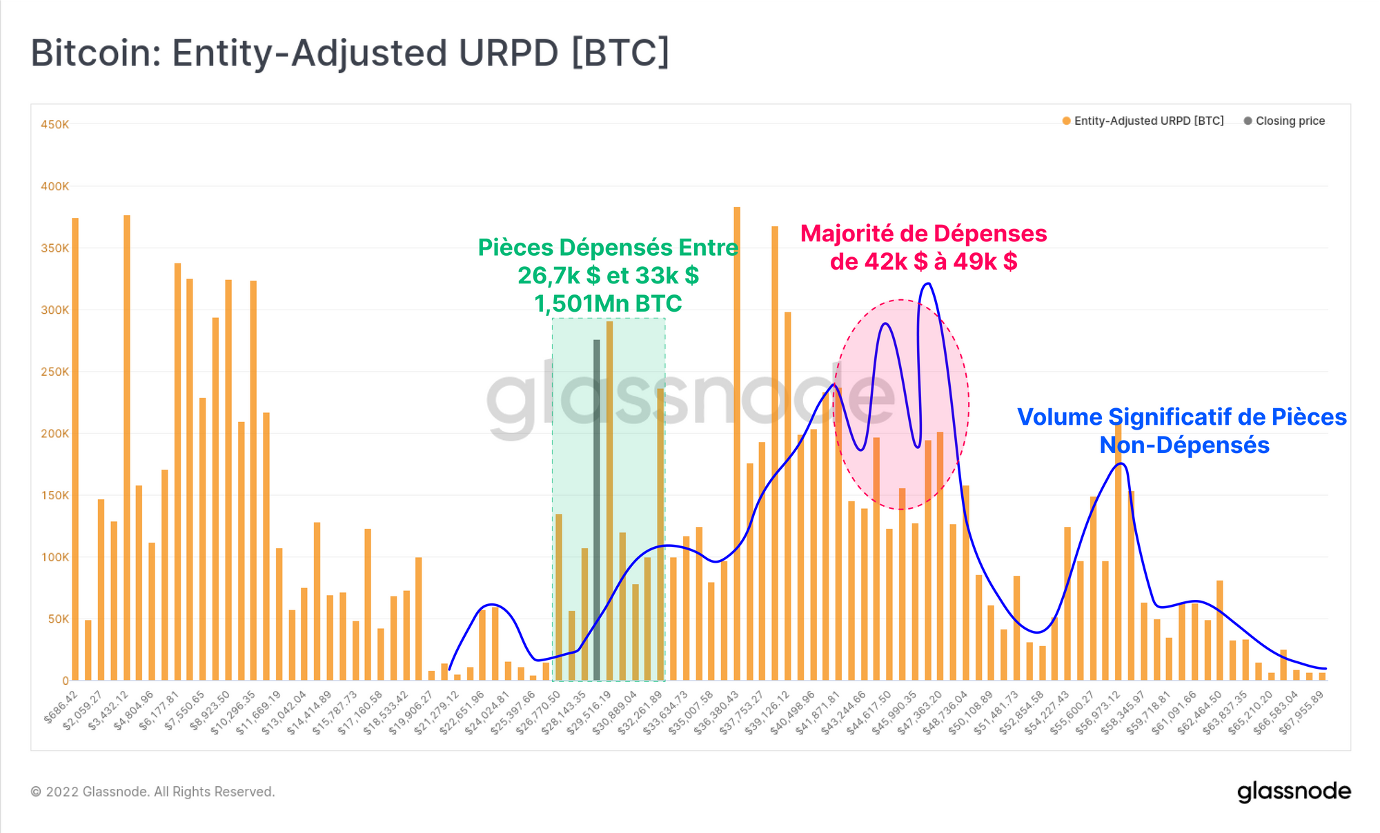 - Une réaffectation importante de 1,5 million de BTC a eu lieu, les acheteurs se situant principalement entre 42 000 et 49 000 dollars et dans la fourchette actuelle de 26,7 000 à 33 000 dollars.