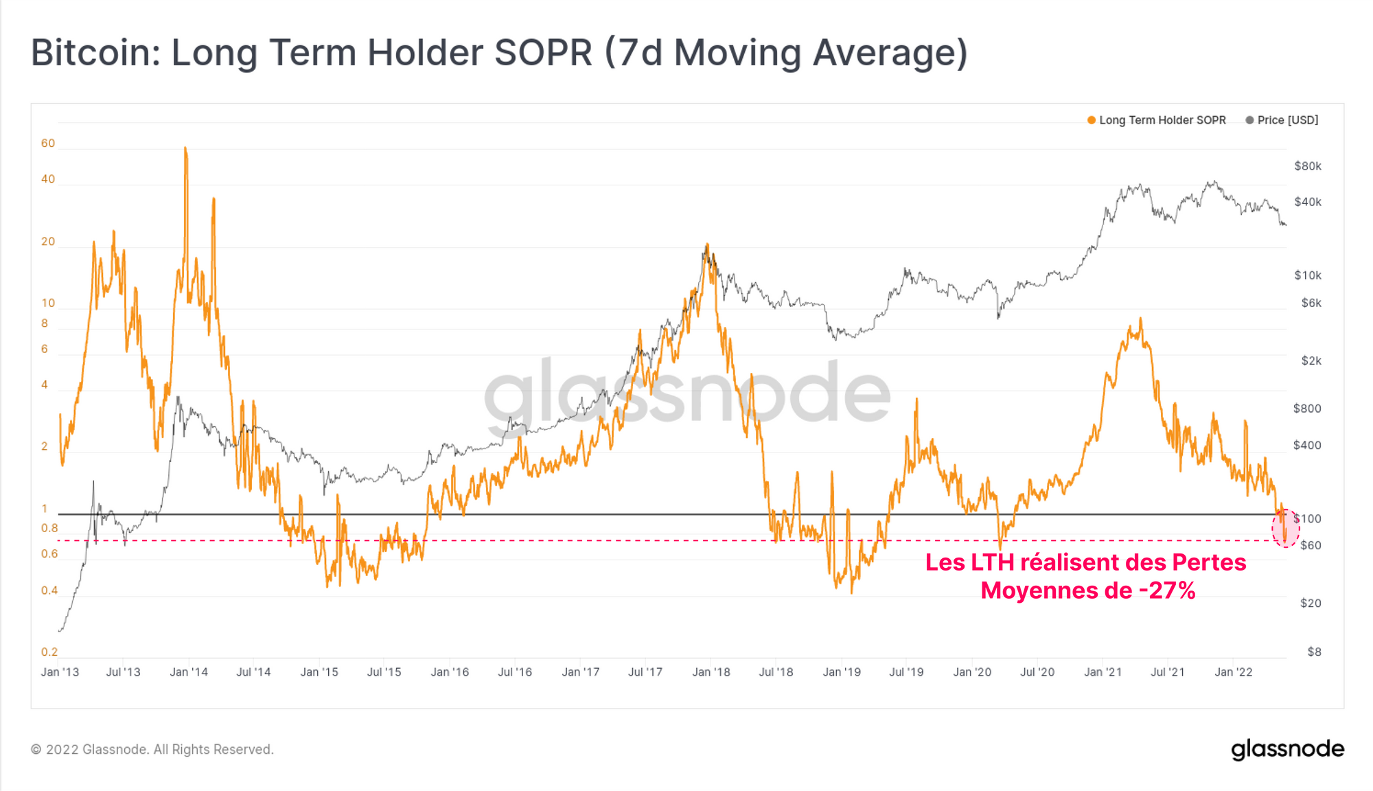 Cette semaine, nous avons vu la pièce moyenne dépensée par un LTH accuser une perte de 27 % par rapport à son prix d'aqcuisition. Par le passé, de tels événements ne se sont produits que lors des creux de capitulation finale de marchés baissiers, comme en 2015, 2018 et brièvement en mars 2020.