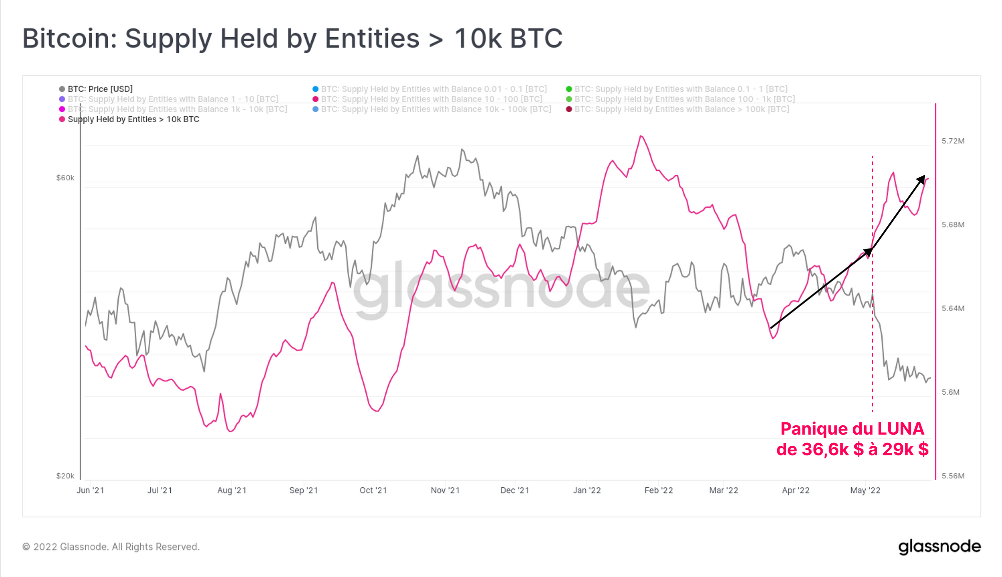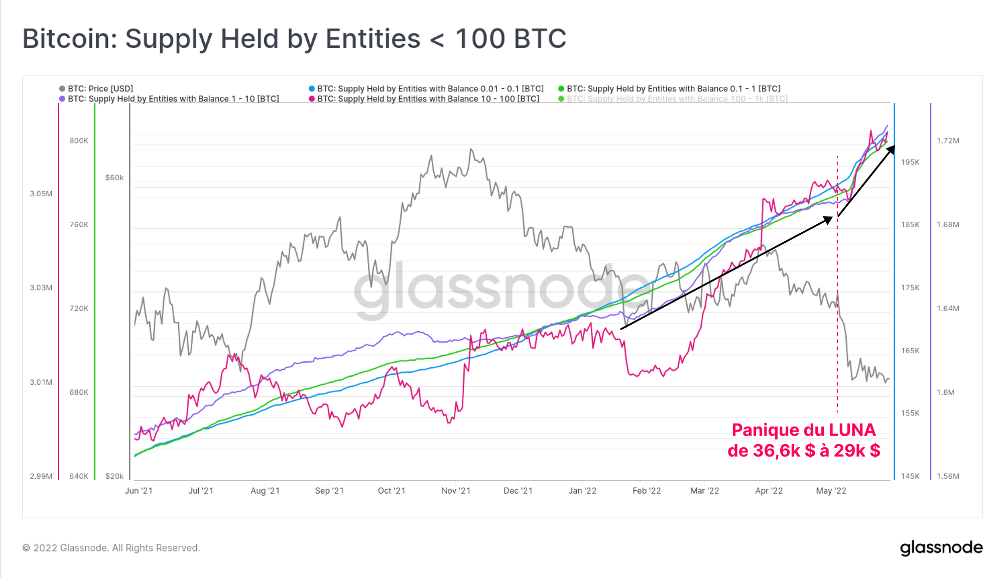 En effet, l'augmentation de la demande des entités < 100 BTC à des prix plus bas a compensé l'offre liquidée par la LFG dans le but de défendre la parité de l'UST.