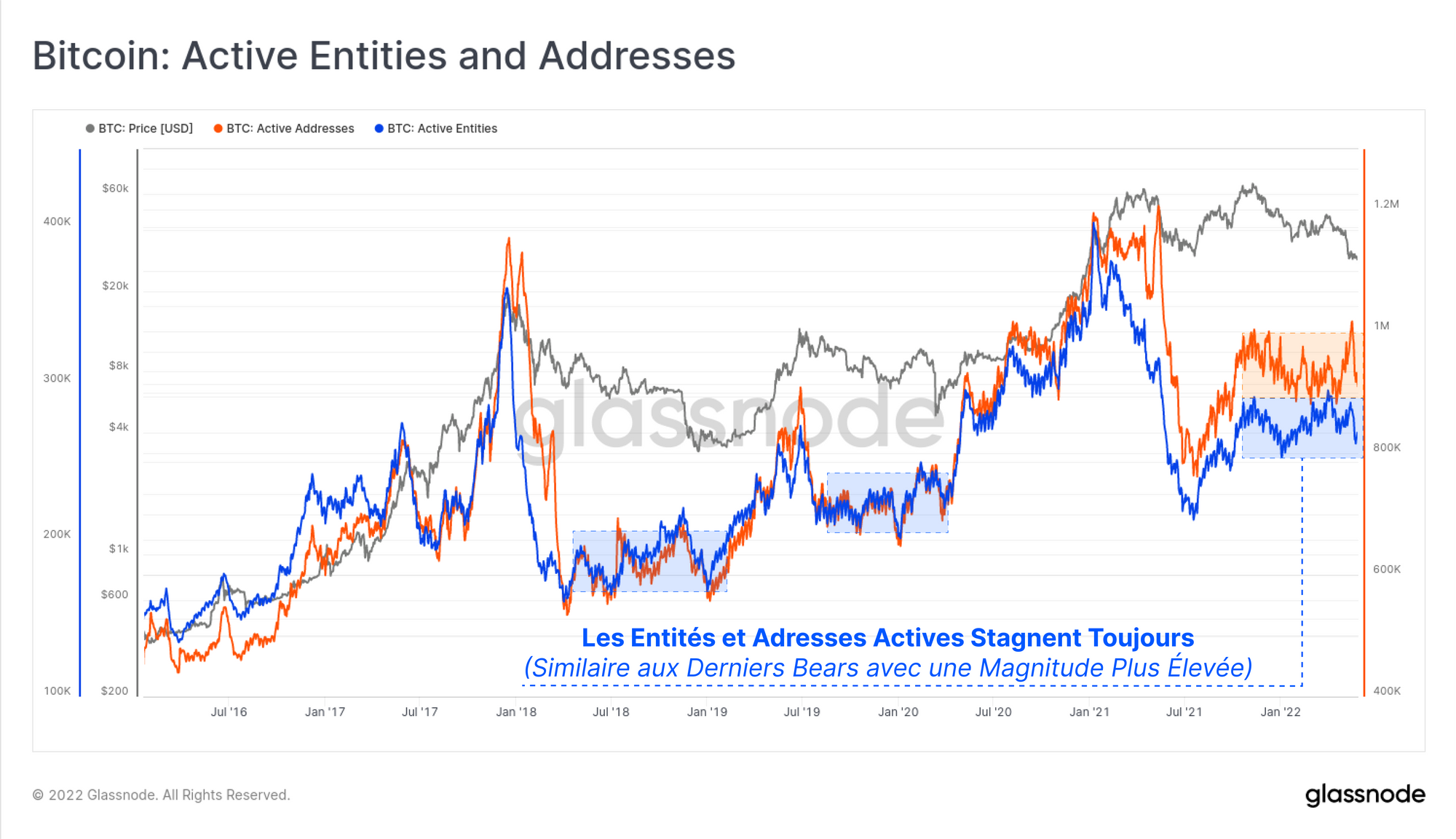 Bien que cette possibilité ne puisse être exclue, nous pouvons constater que les adresses et les entités actives ont "rendu" toute cette hausse d'activité et sont revenues dans la fourchette établie depuis septembre 2021. En d'autres termes, la récente liquidation et la baisse des prix n'ont pas encore entraîné un afflux de nouveaux utilisateurs et seuls les HODLers restent.