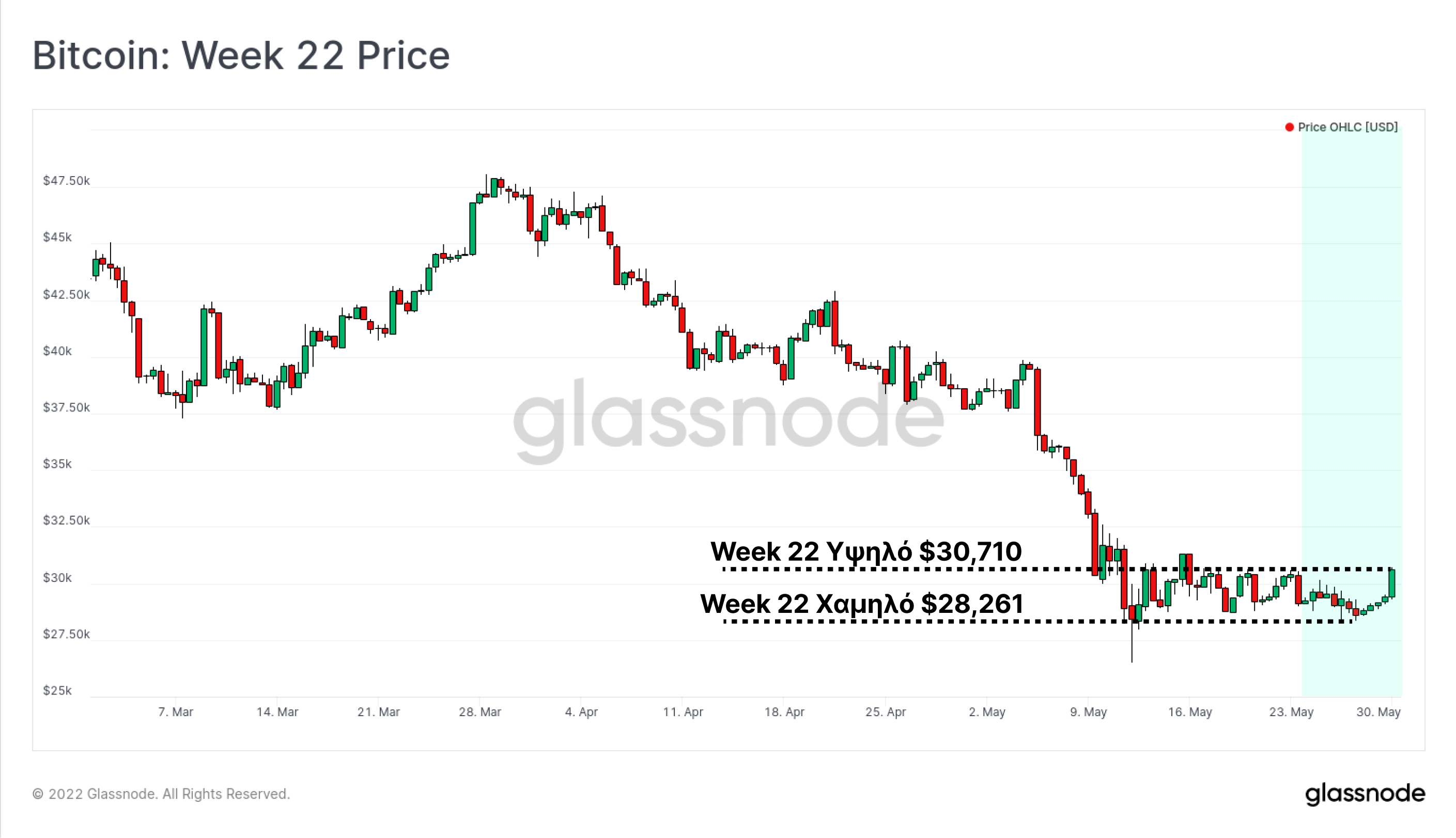Οι τιμές του Bitcoin συνέχισαν να παγιώνονται αυτή την εβδομάδα, μετά από τις αρχικές ενδείξεις μιας πιθανής αποσύνδεσης μεταξύ των αγορών των ψηφιακών περιουσιακών στοιχείων και των παραδοσιακών αγορών μετοχών, αν και προς τη λάθος κατεύθυνση. Ο δείκτης S&P500 σημείωσε ράλι 7,4% από τα χαμηλά του αυτή την εβδομάδα και ο NASDAQ σημείωσε άνοδο 9,6%. Εν τω μεταξύ, το Bitcoin διαπραγματευόταν στο χαμηλό επίπεδο των 28.261 δολαρίων και ανέκαμψε μόνο νωρίς τη Δευτέρα για να ανακτήσει το εβδομαδιαίο υψηλό των 30.710 δολαρίων. Το Ethereum είχε επίσης μια δύσκολη εβδομάδα, χάνοντας το 17,8% της αξίας του στο χαμηλό των 1.700 δολαρίων, πριν ανακάμψει στα 1.900 δολάρια το πρωί της Δευτέρας.