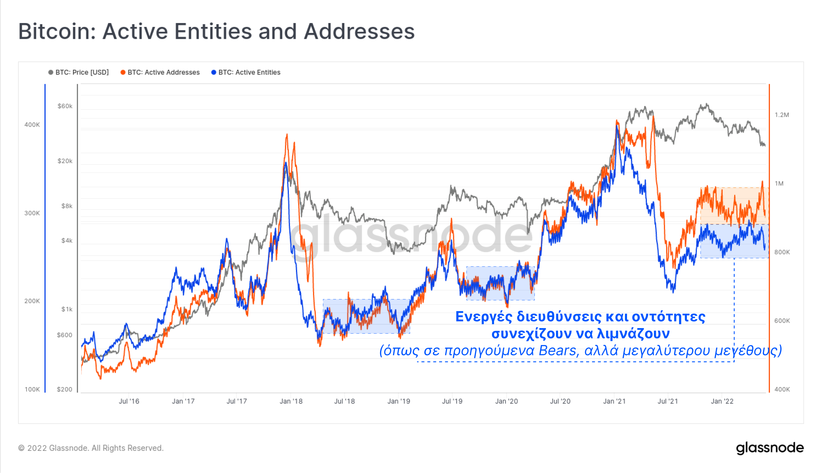 Ενώ δεν μπορεί να αποκλειστεί αυτή η πιθανότητα, μπορούμε να δούμε ότι τόσο οι Ενεργές Διευθύνσεις όσο και οι Οντότητες έχουν "ανταποδώσει" όλη αυτή την άνοδο της δραστηριότητας και έχουν επιστρέψει στο εύρος που έχει καθιερωθεί από τον Σεπτέμβριο του 2021. Με άλλα λόγια, το πρόσφατο ξεπούλημα και οι χαμηλότερες τιμές δεν ενέπνευσαν ακόμη εισροή νέων χρηστών στο χώρο και παραμένουν μόνο οι HODLers.