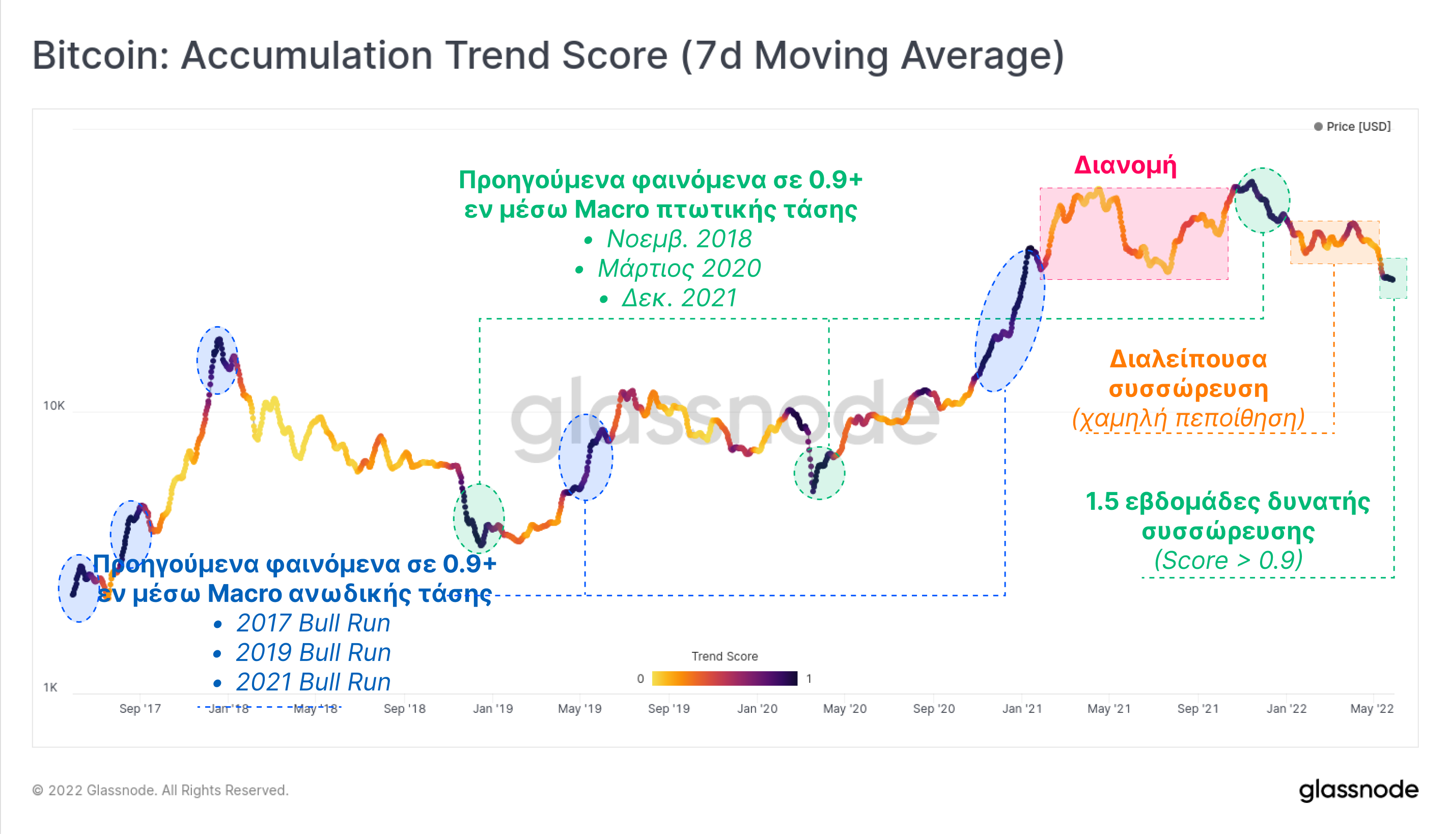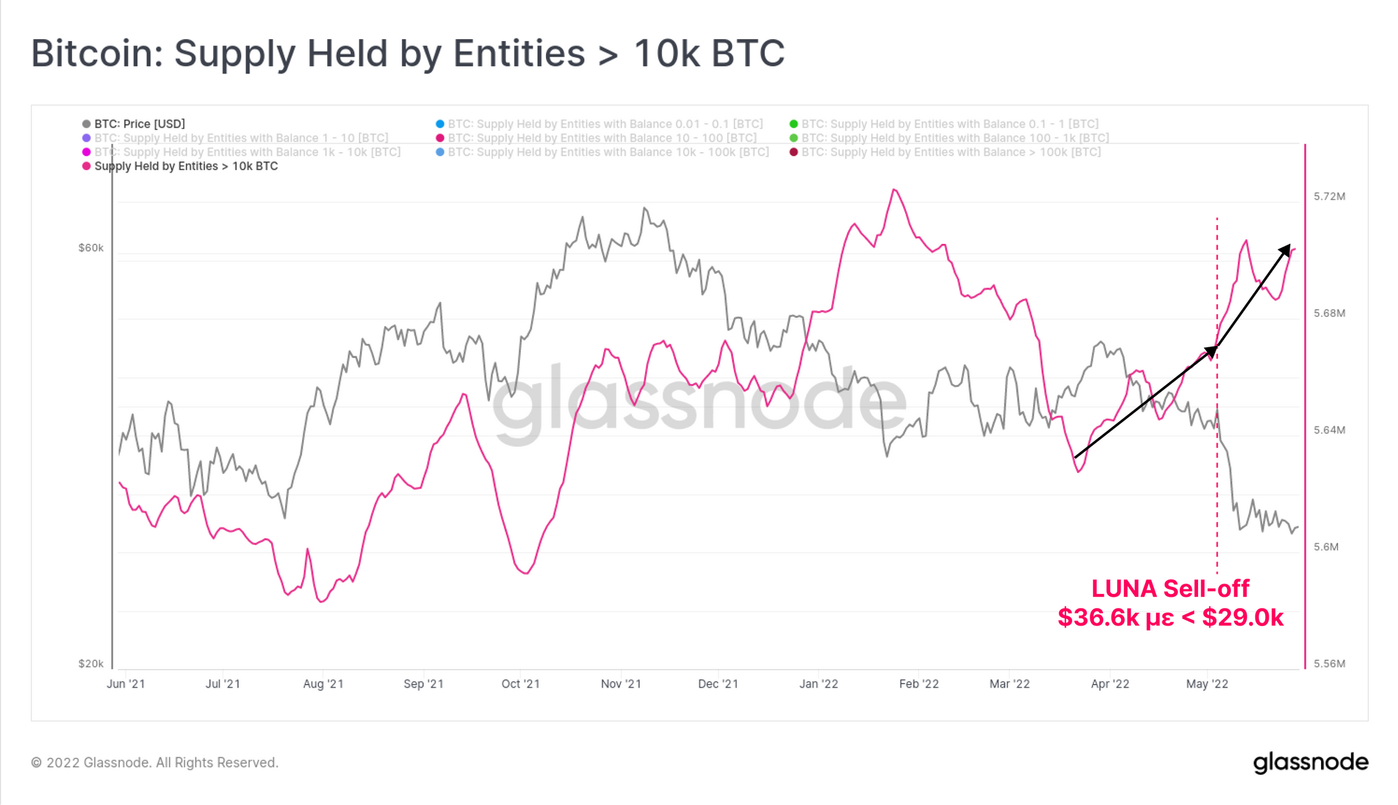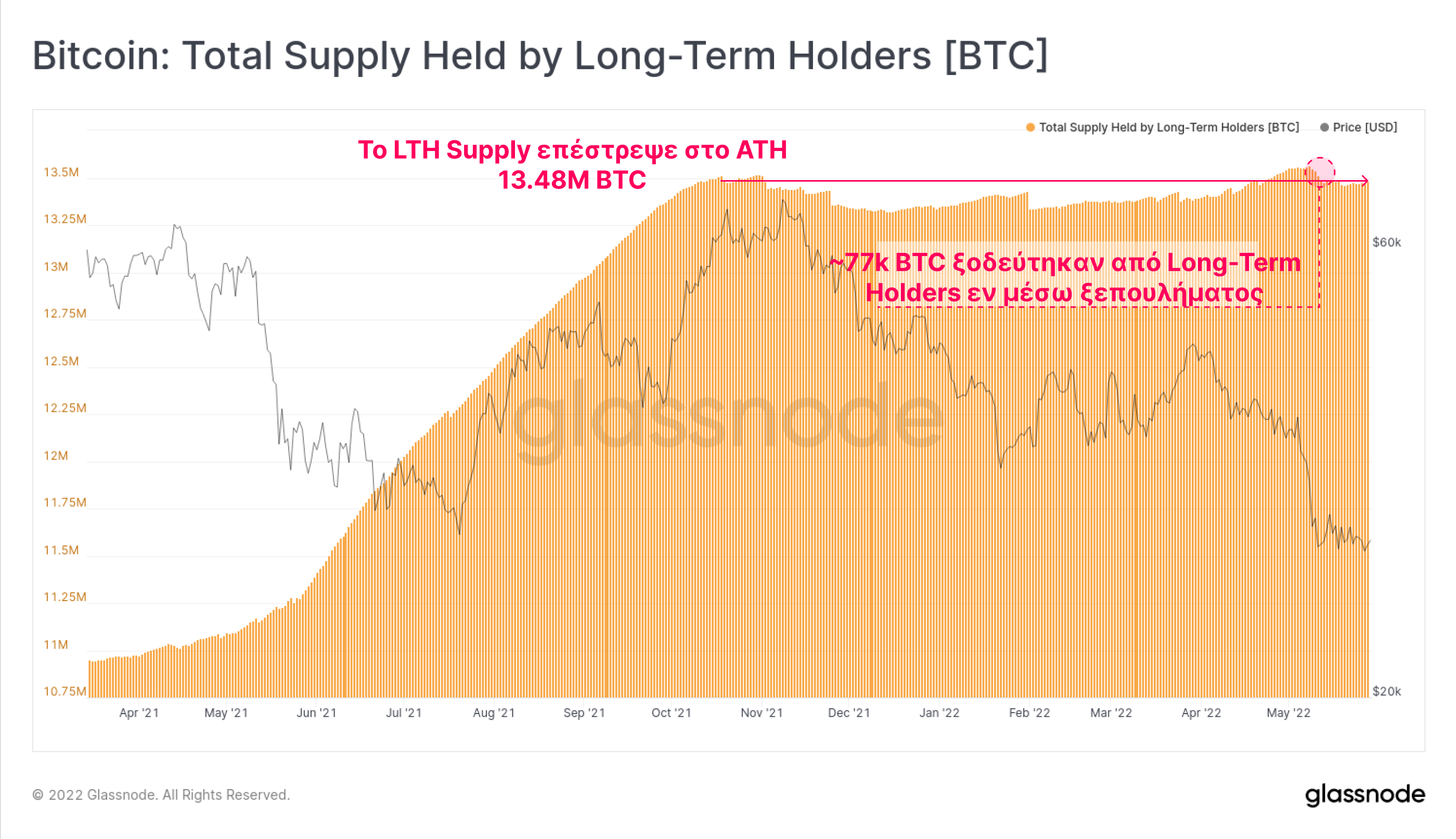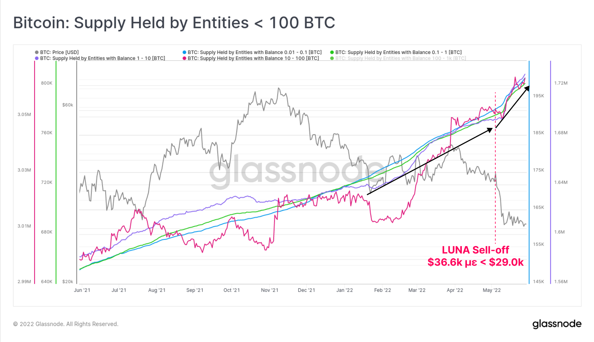 Μια αξιοσημείωτη μετατόπιση σημειώθηκε στις τάσεις συσσώρευσης στην αλυσίδα μετά το ξεπούλημα που προκάλεσε το LUNA. Οντότητες με < 100BTC φαίνεται να έχουν απορροφήσει έναν όγκο νομισμάτων ισοδύναμο με αυτόν που πωλήθηκε λόγω κινδύνου από το Luna Foundation Guard. Παράλληλα με την πλειονότητα των Μακροπρόθεσμων holders, ένας ολοένα και μεγαλύτερος όγκος BTC εμφανίζεται να έχει αποκτηθεί ως HODL και να έχει αποκτηθεί σε αυτές τις χαμηλότερες τιμές. Αυτή η τάση, αν δεν διαταραχθεί, αναμένεται να ωθήσει το απόθεμα των Μακροπρόθεσμων holder πάνω από το ATH τους επόμενους μήνες.