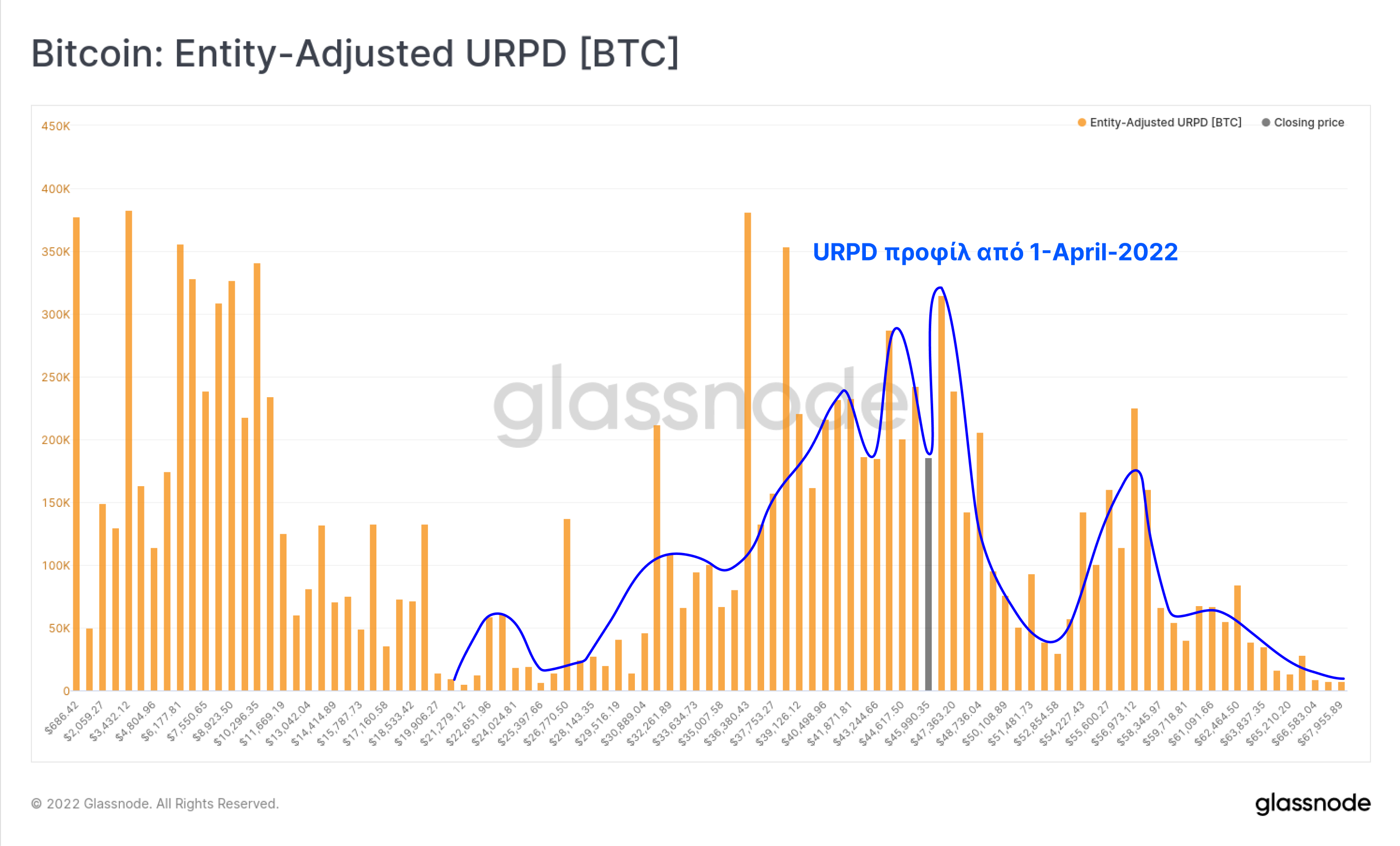 Παρακάτω, φέρνουμε αυτό το προφίλ της 1ης Απριλίου και το επικαλύπτουμε με το σημερινό URPD με μπλε χρώμα. Από αυτό μπορούμε να αξιολογήσουμε την αλλαγή στην κατανομή των νομισμάτων και να κάνουμε τις ακόλουθες παρατηρήσεις:
