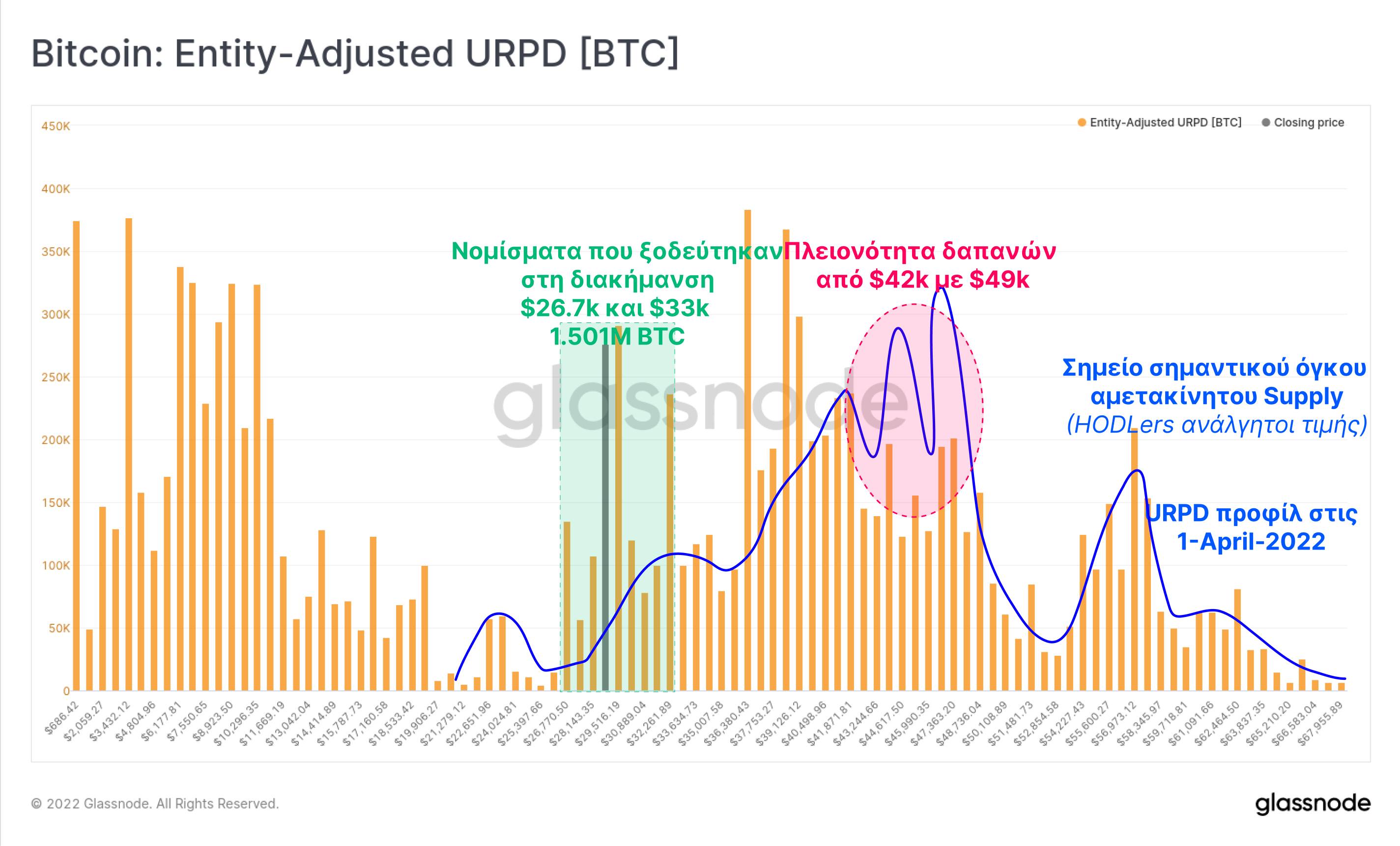 - Μια σημαντική ανακατανομή 1,5 εκατ. BTC έχει συμβεί από αγοραστές που βρίσκονταν σε μεγάλο βαθμό στο εύρος 42k έως 49k δολάρια, σε αγοραστές στο σημερινό εύρος 26,7k έως 33k δολάρια.