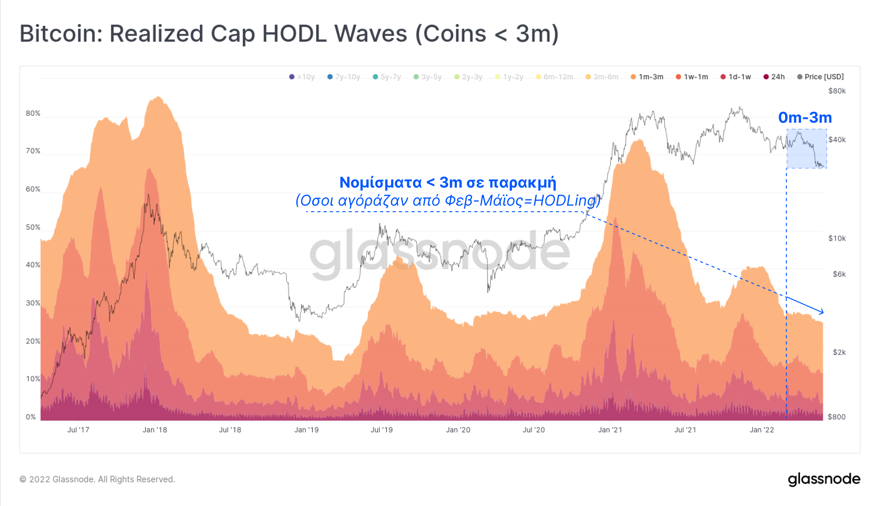 Η τρέχουσα πτωτική τάση των νομισμάτων με ηλικία μικρότερης των 3 μηνών ενισχύει αυτή την παρατήρηση. Η αναδρομή στο τελευταίο 3μηνο καταγράφει όλα τα νομίσματα που ξοδεύτηκαν για τελευταία φορά μετά την 1η Μαρτίου, η οποία είναι η μέση της τελευταίας περιόδου σταθεροποίησης. Όταν υφίσταται μια πτωτική τάση στα HOLD waves της ηλικιακής ομάδας των 3 μηνών, σημαίνει πως η ποσότητα αυτων των νομισμάτων μεταφέρονται σε ηλικιακά παλαιότερες ομάδες ταξινόμησης.