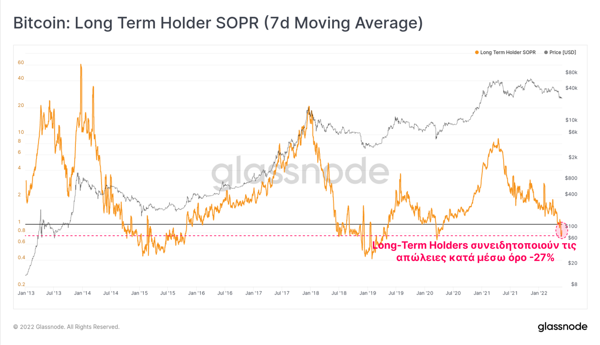 Αυτή την εβδομάδα, είδαμε ότι ο μέσος Μακροπρόθεσμος Holder ξόδεψε νομίσματα κλειδώνοντας μια απώλεια 27% σε σύγκριση με το σημείο απόκτησης του νομίσματος. Τέτοια γεγονότα στο παρελθόν έχουν εμφανιστεί μόνο κατά τη διάρκεια των τελικών κατώτατων σημείων κεφαλαιοποίησης των bear markets, όπως το 2015, το 2018 και για λίγο τον Μάρτιο του 2020.