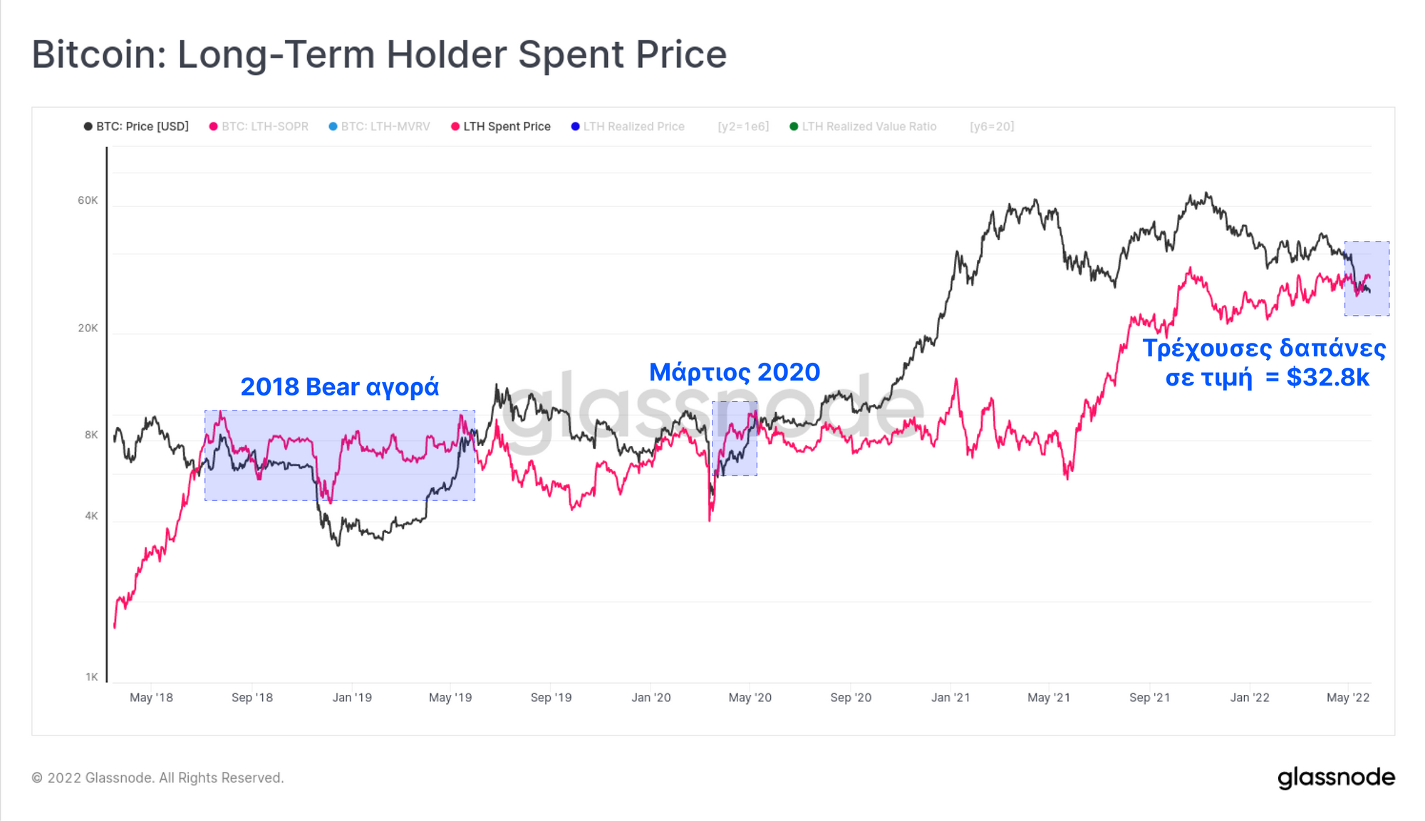 Με την έννοια του LTH-SOPR ως πολλαπλασιαστή του πραγματοποιημένου κέρδους, μπορούμε να εξάγουμε τη μέση τιμή από την οποία "προέρχονται" τα χρησιμοποιημένα νομίσματα των Μακροπρόθεσμων Holders, η οποία ονομάζεται Τιμή Χρησιμοποιημένου Κέρδους (Spent Price). Η Τιμή Χρησιμοποιημένου Κέρδους των Μακροπρόθεσμων Holder (LTH Spent Price) (ροζ) σπάνια διαπραγματεύεται πάνω από την τιμή της αγοράς, αλλά ωστόσο αυτή τη στιγμή διαπραγματεύεται στα $32,8k με βάση του κινητού μέσου όρου 7 ημερών. Η τελευταία φορά που οι Μακροπρόθεσμοι Holders παγιδεύτηκαν σε απώλειες όπως αυτή, ήταν για λίγο μετά το γεγονός του ξεπουλήματος του Μαρτίου 2020. Στην περίπτωση της bear market του 2018, αυτό προηγήθηκε πολλών μηνών απωλειών των Μακροπρόθεσμων Holder και κορυφώθηκε με μια πρόσθετη πτώση των τιμών κατά 50%.