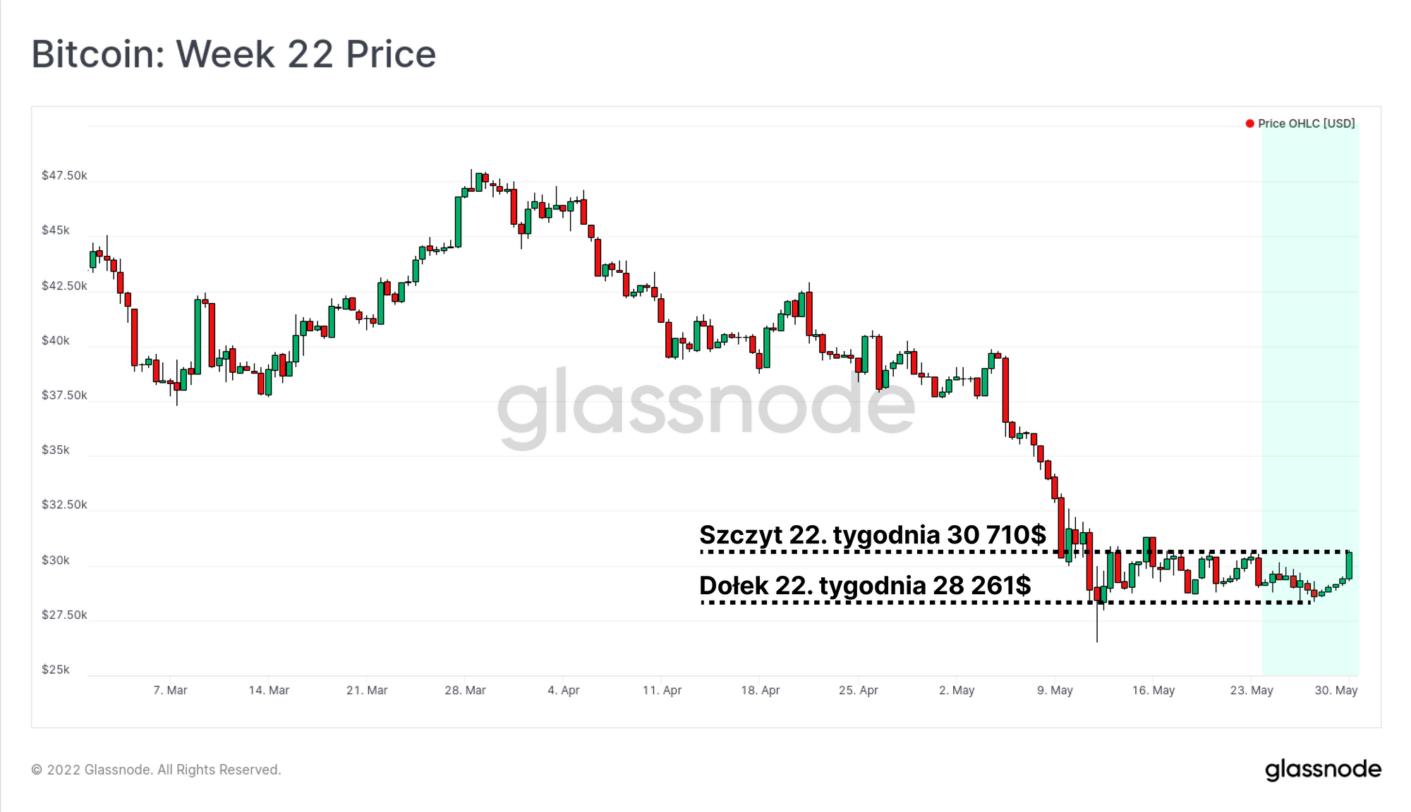 Po początkowych oznakach potencjalnego „zerwania więzów” między rynkami aktyw cyfrowych a tradycyjnymi rynkami akcji, w poprzednim tygodniu notowania Bitcoina kontynuowały swoją konsolidację. Indeks S&P500 poszybował o 7,4% w górę od ubiegłotygodniowego dołka, a indeks NASDAQ o 9,6%. Tymczasem kurs Bitcoina spadł do dołka na poziomie 28 261$ i zaczął rosnąć dopiero w poniedziałek, osiągając tygodniowe maksimum wynoszące 30 710$. Ethereum także miało ciężki tydzień, tracąc 17,8% swojej wartości i spadając do najniższego poziomu ubiegłego tygodnia - 1700$ - po czym kurs uległ odbiciu osiągając 1900$ w poniedziałek rano.