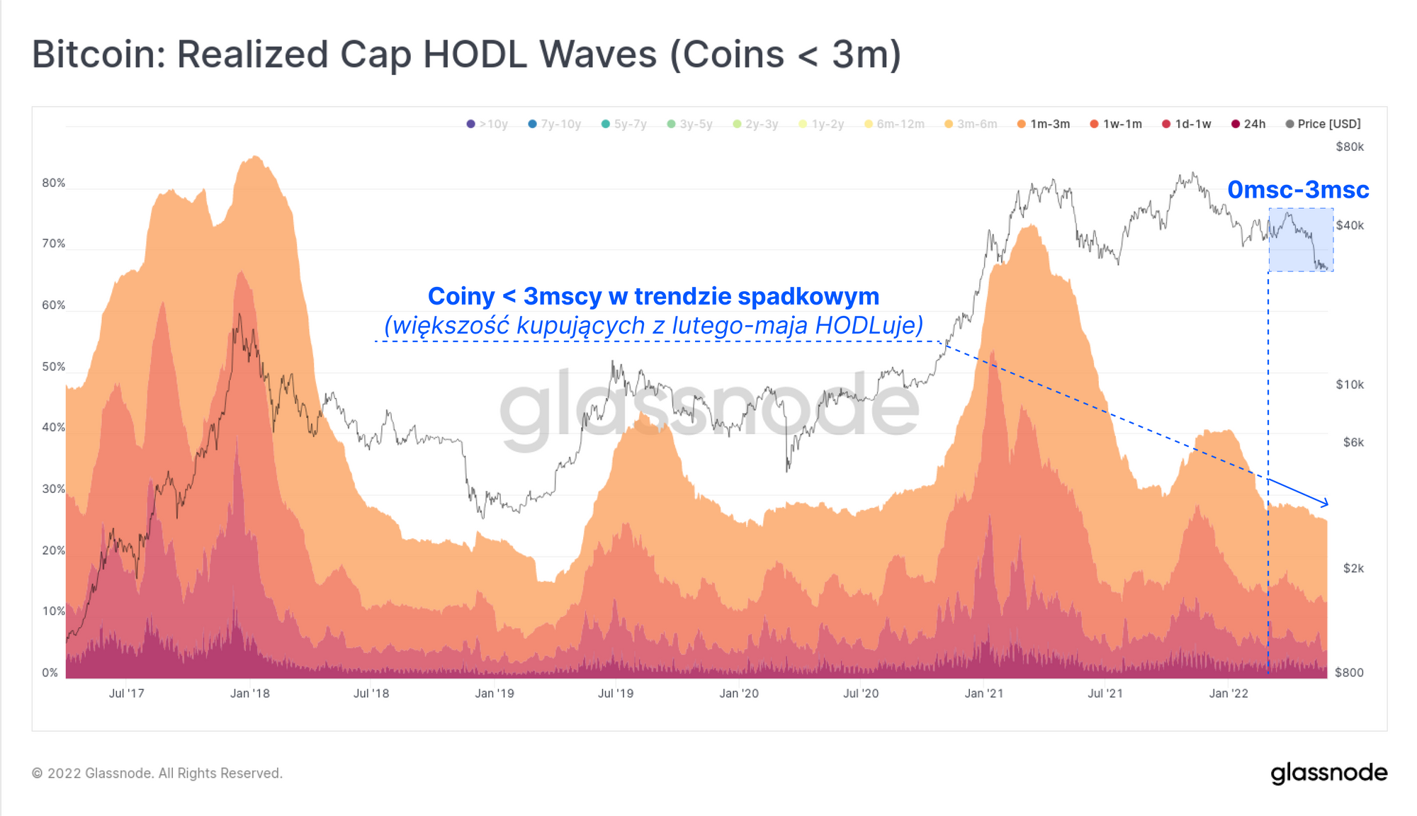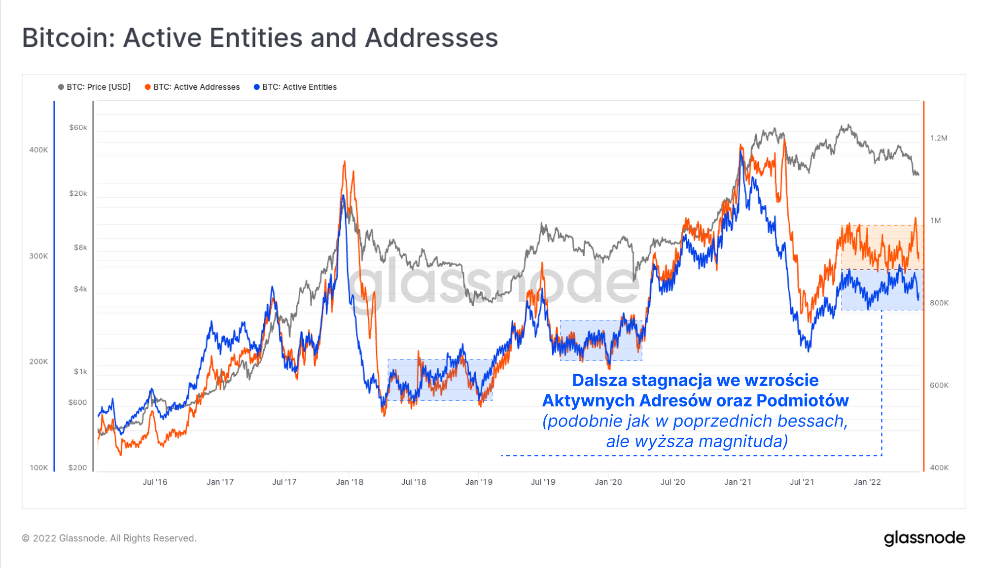 Chociaż nie można wykluczyć takiej możliwości, to widzimy, że zarówno ilość aktywnych adresów, jak i podmiotów „oddały” cały ten wzrost aktywności i powróciły do zakresu ustalonego od września 2021 roku. Innymi słowy - ostatnie spadki i coraz to niższe ceny nadal nie spowodowały napływu nowych użytkowników na rynek i pozostali tu jedynie HODLerzy.