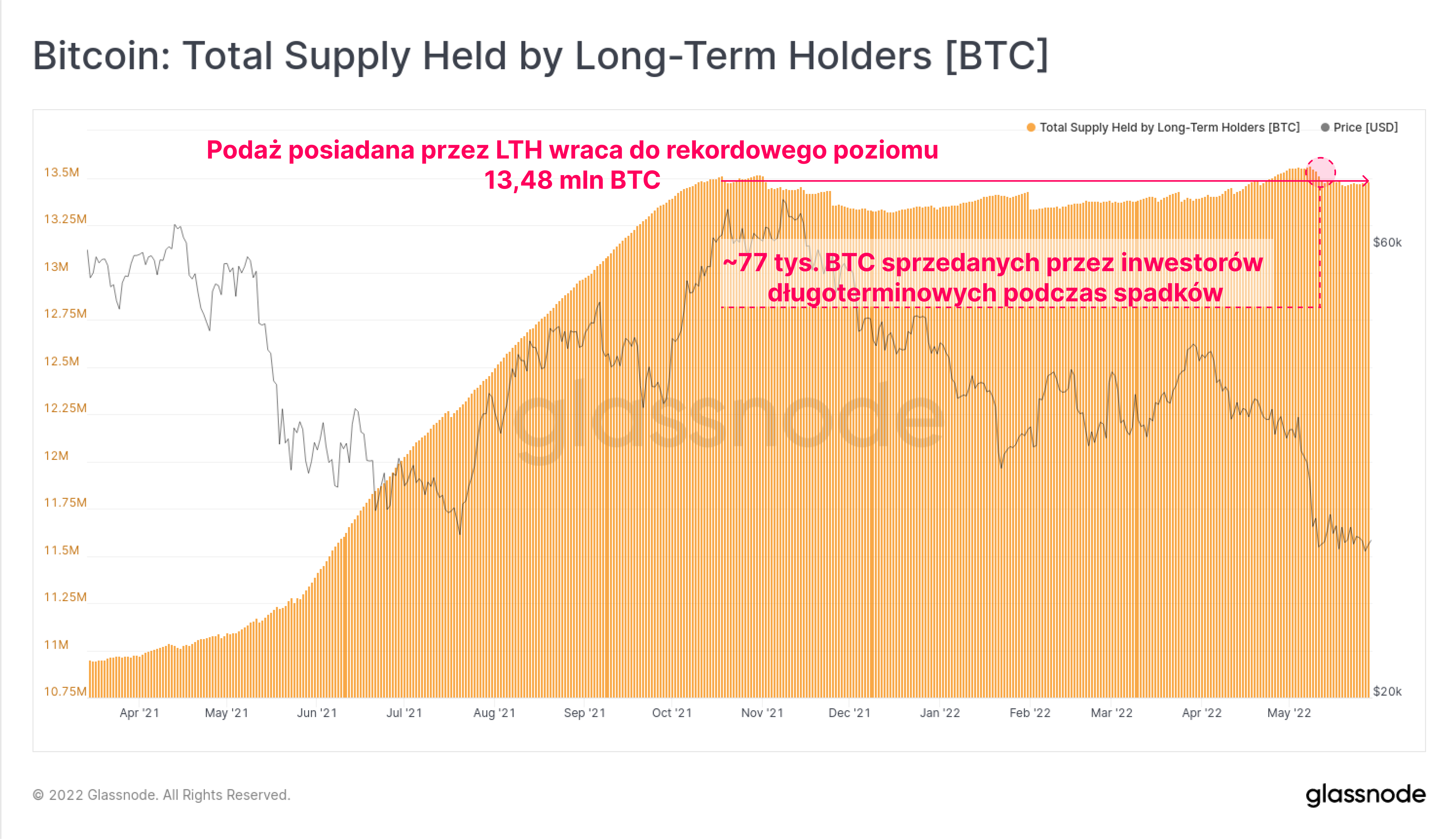 Widoczna zmiana w trendzie akumulacji on-chain miała miejsce po spadkach wywołanych przez upadek LUNY. Wydaje się, iż podmioty posiadające poniżej 100 BTC wchłonęły ekwiwalent tego, co w krytycznym momencie sprzedała Luna Foundation Guard. Wraz ze wzrostem ilości LTH, rośnie także ilość HODLowanych BTC oraz tych kupowanych po obecnych, niskich cenach. W nadchodzących miesiącach oczekuje się, iż trend ten, o ile nie ulegnie zakłóceniu, ustanowi kolejny rekord w wielkości podaży posiadanej przez inwestorów długoterminowych.