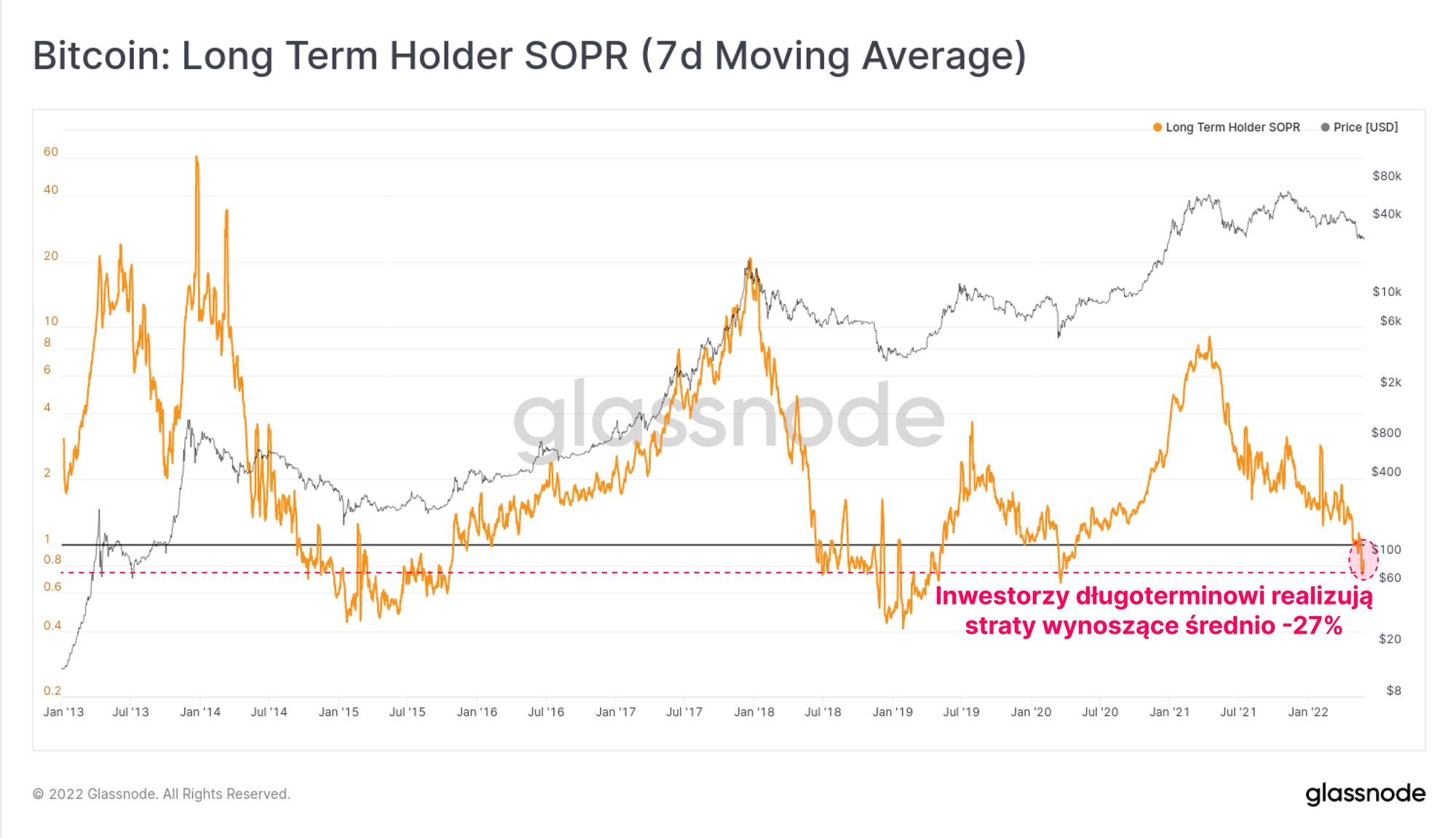 W tym tygodniu LTH, którzy decydowali się na sprzedaż swoich coinów, robili to ze średnio 27% stratą względem momentu zakupu kryptowalut. W przeszłości takie zachowania zauważaliśmy jedynie podczas ostatecznych dołków i kapitulacji w trakcie danej bessy, jak na przykład w roku 2015, 2018 i chwilowo w marcu 2020.