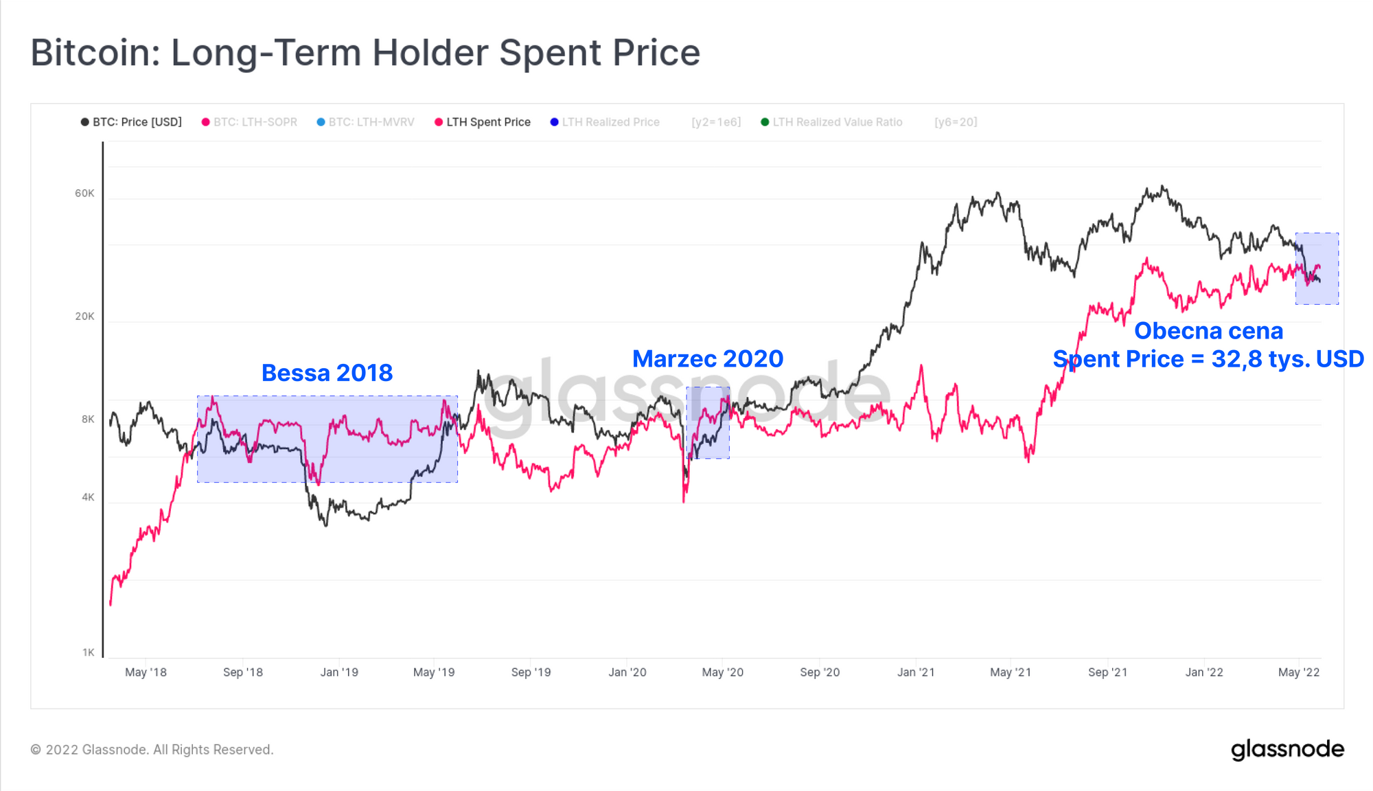 Dzięki koncepcji LTH-SOPR jako wielokrotności realizowanych zysków, możemy też uzyskać średnią cenę, z której „pochodzą” coiny wyprzedawane przez inwestorów długoterminowych. Wskaźnik ten nazywa się Spent Price. Wykres LTH Spent Price niezwykle rzadko znajduje się powyżej ceny rynkowej, jednakże obecnie notowany jest na poziomie 32,8 tys. dolarów bazując na 7-dniowej średniej kroczącej. Ostatnim razem LTH odnotowywali takie straty krótko po spadkach z marca 2020 roku. Natomiast w przypadku bessy w 2018 roku, realizowanie strat przez LTH trwało wiele miesięcy i zakończyło się dodatkowym 50% spadkiem ceny.