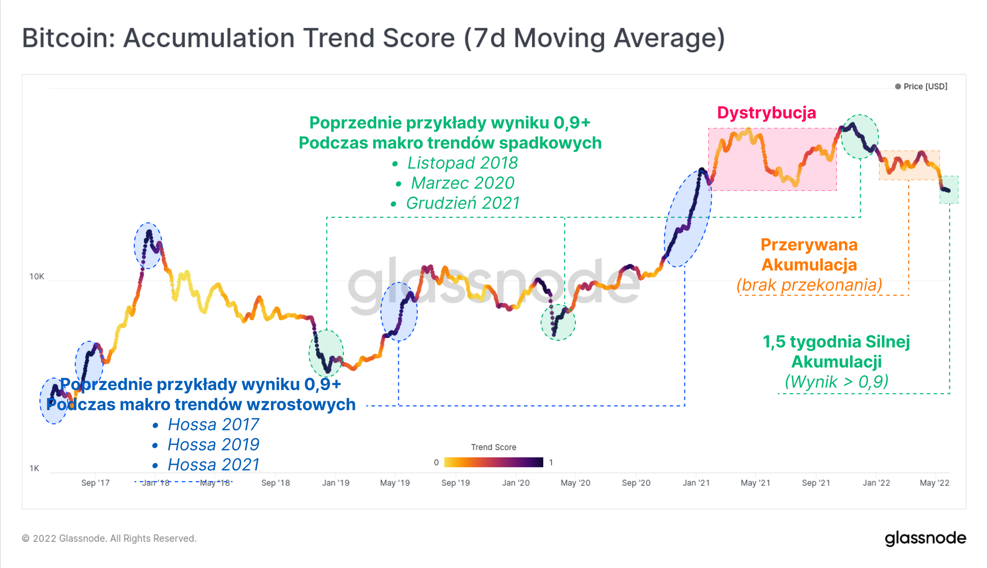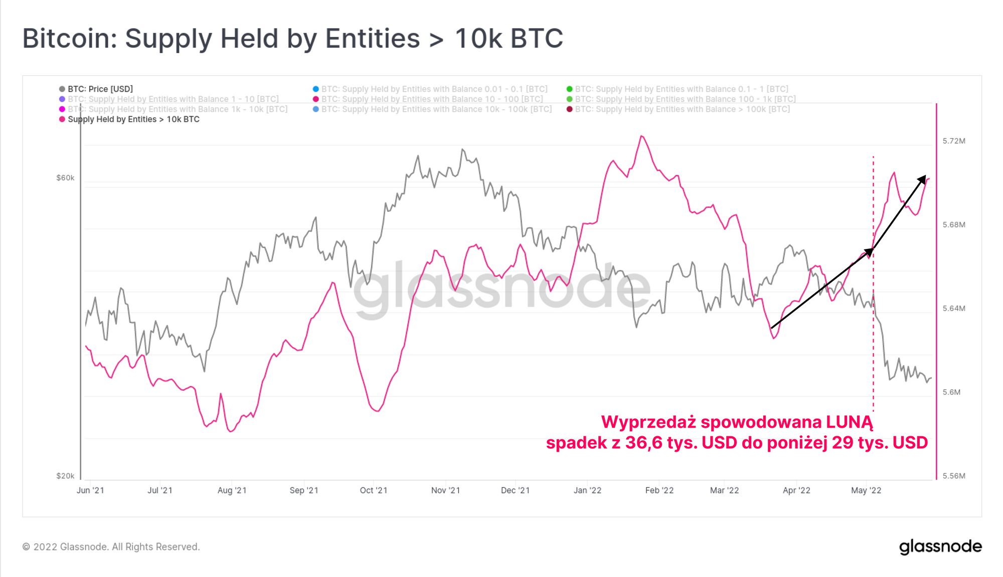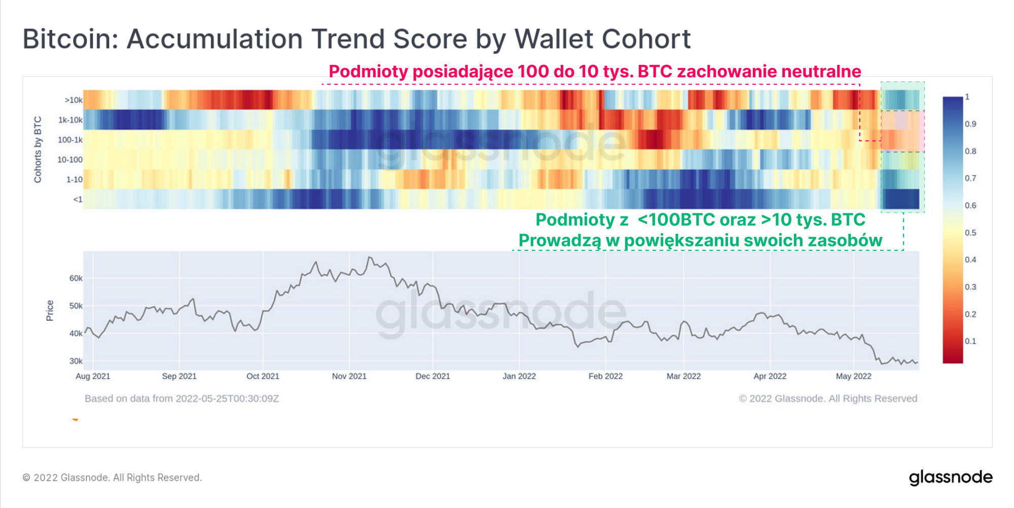 Po spadkach wywołanych krachem LUNY na początku miesiąca, nastąpiła wyraźna zmiana zachowań związanych z akumulacją Bitcoina on-chain. W szczególności podmioty z portfelami poniżej 100 BTC oraz powyżej 10 tys. BTC stanowiły najistotniejszych akumulujących. Pozostałe przedziały portfeli przeszły z dystrybucji netto do nastawienia neutralnego. Odzwierciedla to zauważalną zmianę w zachowaniu w porównaniu do okresu od lutego do połowy maja, który to przepleciony był okresami akumulacji i dystrybucji, odzwierciedlając niepewność oraz rotację kapitału na rynku.