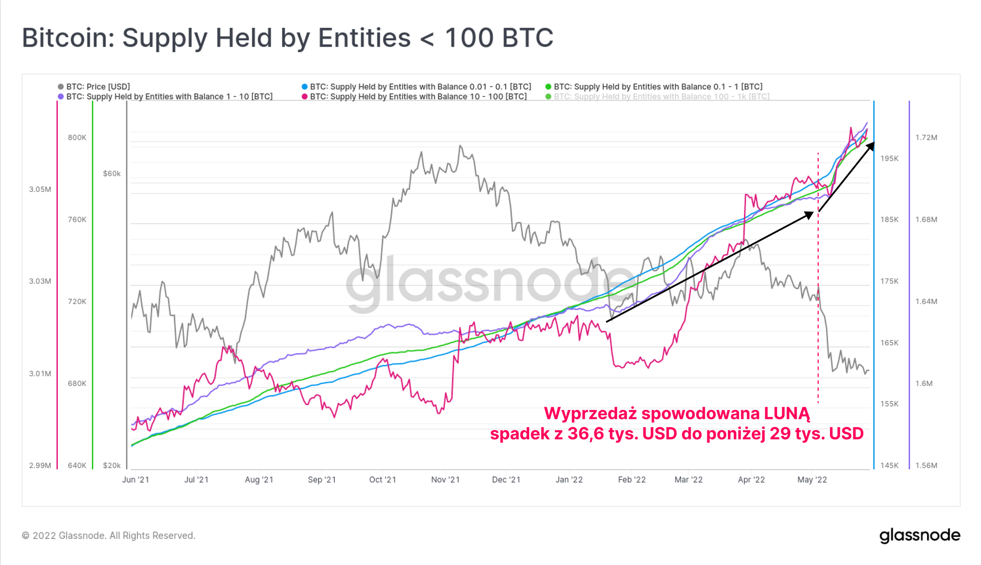 Przyglądając się tej pierwszej grupie, możemy zauważyć, że ich łączne zasoby portfeli uległy zwiększeniu po ostatniej rynkowej wyprzedaży. Co więcej, zsumowany balans tych inwestorów wzrósł o 80 724 BTC, co jest wartością niezwykle zbliżoną do 80 081 BTC zlikwidowanych przez Luna Foundation Guard (więcej informacji tutaj). W efekcie zwiększonego popytu ze strony podmiotów <100 BTC na niższych poziomach cenowych, nastąpiła rekompensata podaży zlikwidowanej przez LFG próbując ratować kurs UST.