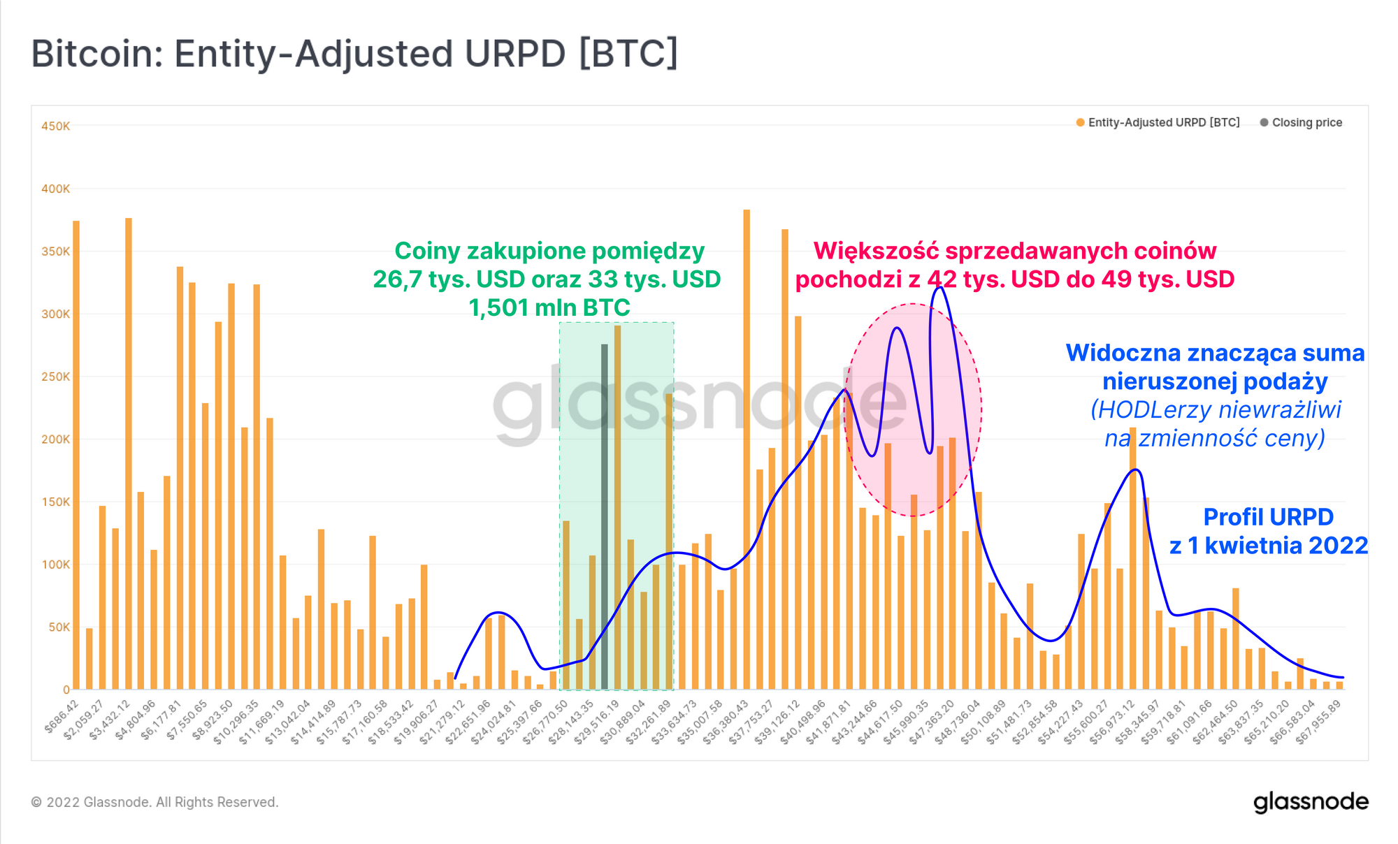 - Nastąpiła znacząca relokacja 1,5 mln BTC od kupujących w przedziale 42-49 tys. USD do kupujących w obecnym przedziale 26,7-33 tys. USD.