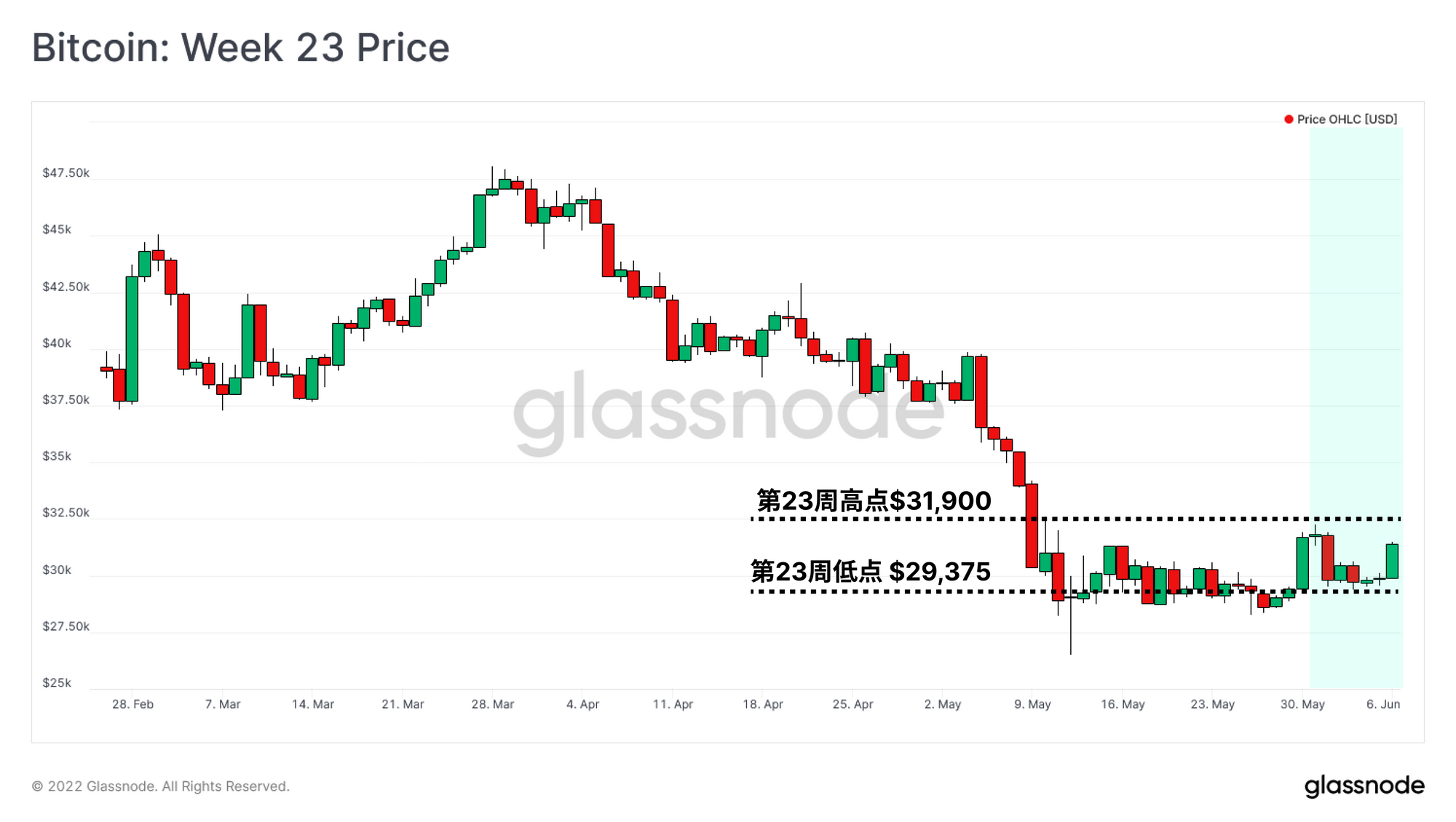 市场终于从连续九周的血腥下跌中走出来,本周以一根周阳线收尾,尽管周涨幅为1.57%,相对来说并不令人振奋。比特币价格在31,900美元的周高点和29,375美元的低点之间震荡。