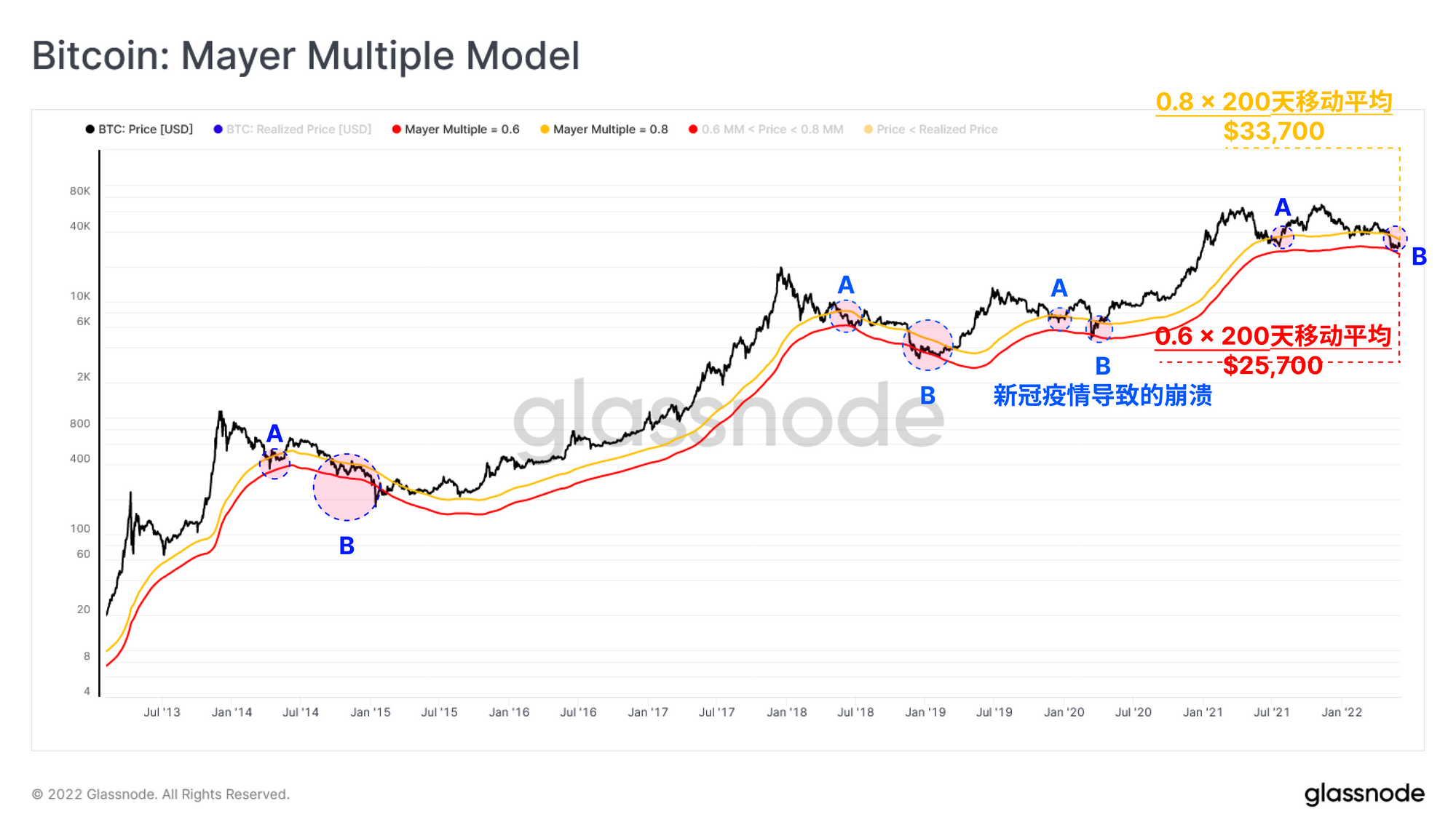 根据最初的分析,超卖或被低估的情况与梅耶倍数在0.6-0.8的范围内下降相吻合。在下图中,我们在200D天移动平均值中使用了这些倍数,用以证明根据梅耶倍数的低估区;0.6 MM < 价格 < 0.8 MM。