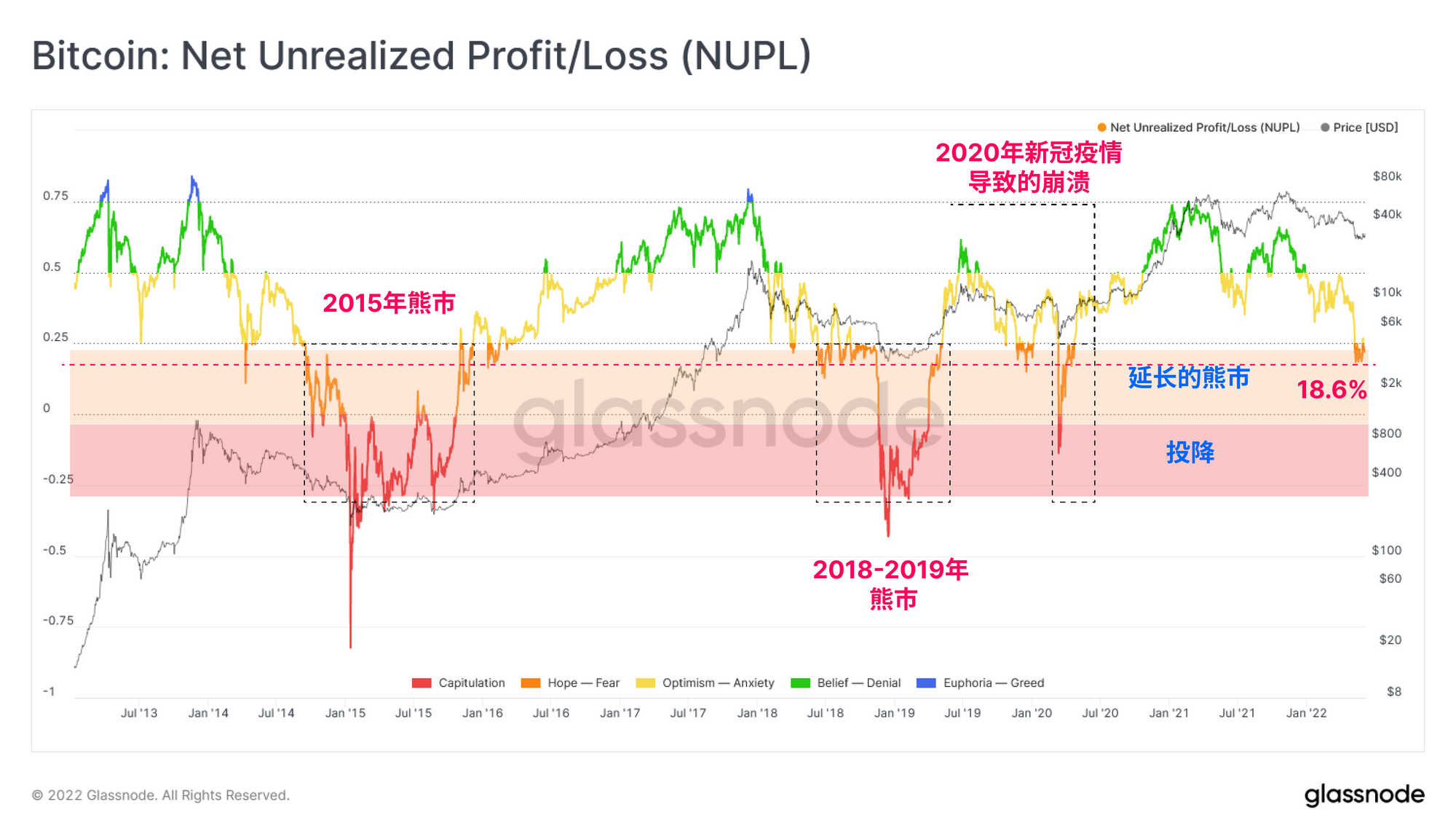 在评估了过去的熊市结构以模拟潜在的周期底部区域后,我们可以通过量化整个网络感受到的"熊市痛苦 "程度来评估这一说法的可信度。未实现的净利润/损失(NUPL)指标映射出网络整体未实现的利润和损失占市值的比例。因此,NUPL可以作为一个指南针来评估这个市场的痛苦阈值。