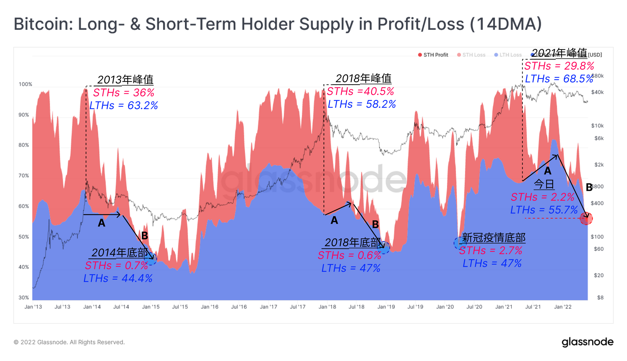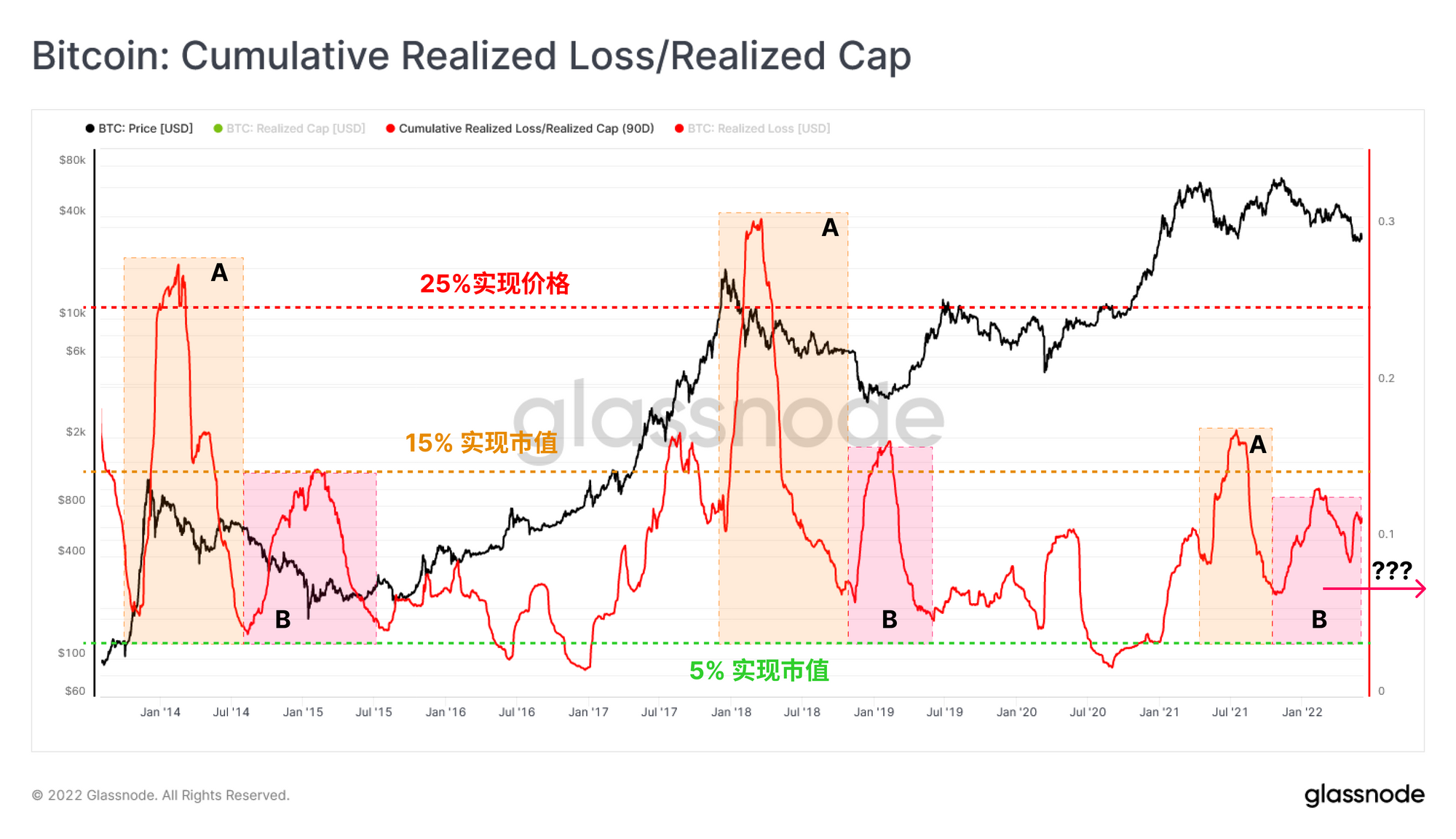 本周期的早期损失浪潮已经通过2021年5月至7月历史前高后的崩溃实现(A阶段)。目前,市场正在经历B阶段,发生投降事件的概率很高,持续的损失正在链上实现。