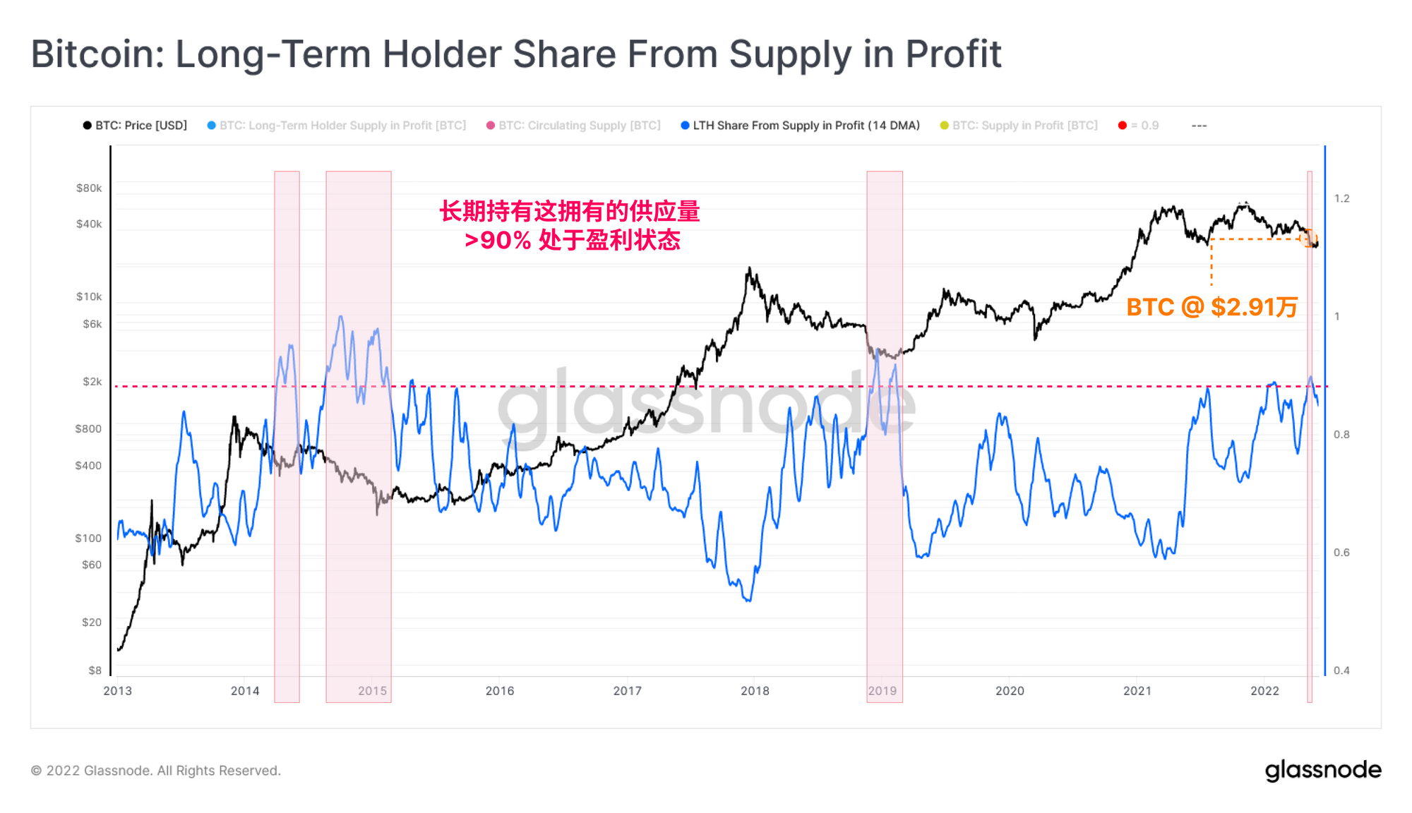 在过去两个延长的熊市中,这个指标的14日移动平均线突破了90%的门槛线。这意味着在看跌价格行为的心理压力下,短期持有者在市场中持有<10%的利润。随着最近的下跌到3万美元以下的范围,这个指标越过了90%的门槛。在这个水平之上,短期持有者基本上已经达到了接近峰值的痛苦阈值,几乎没有未实现的利润持有,而长期持有者主导着剩余的盈利供应。