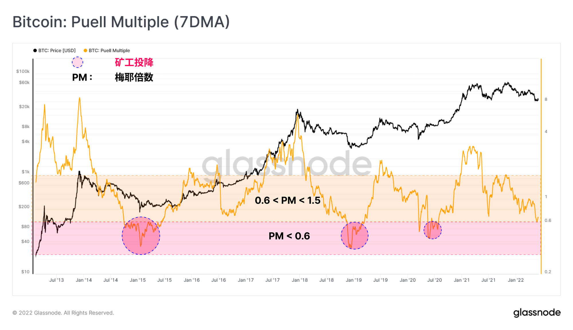 为了给这一分析打下基础,我们首先要从矿工的角度量化市场的盈利能力。Puell倍数是比特币的每日发行价值(以美元计)与该价值的365天移动平均值的比率。