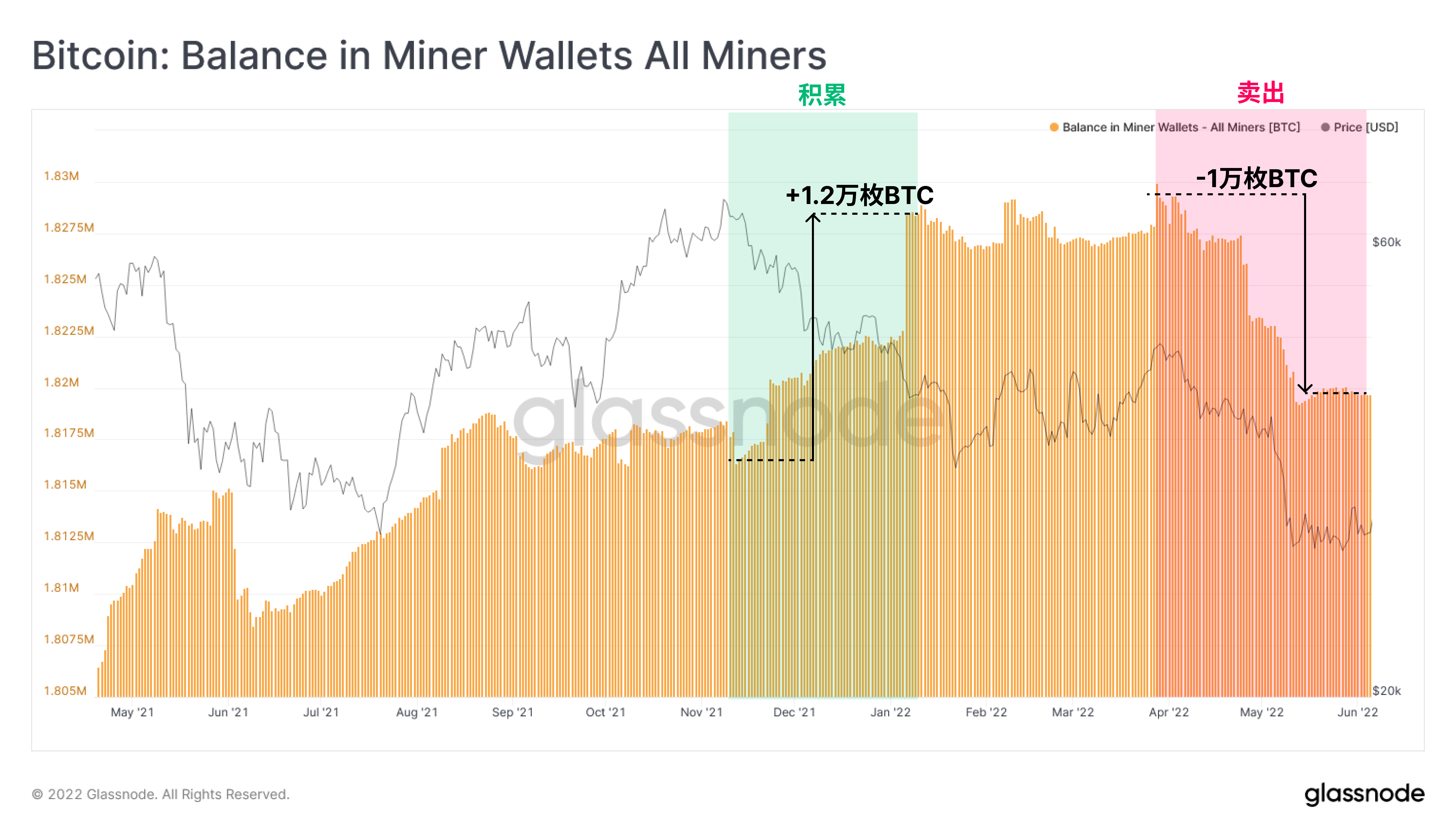 这表明矿工的行为发生了明显的变化,因为他们的余额在历史前高的第一次回撤期间出现了约12000枚比特币的净积累。为了应对因 LUNA基金会出售超过8万枚比特币以试图维持UST挂钩而导致的市场崩溃,矿工们此后卖出了1万枚比特币,增加了市场的卖压。