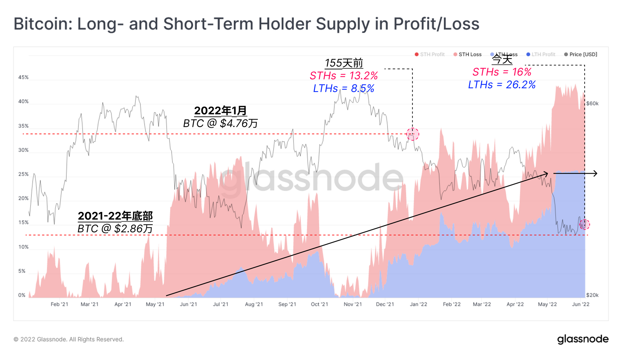 - 短期持有者持有的浮亏供应量也大致稳定,占总供应量的16%至18%左右震荡。请注意,155天前(2022年1月1日)的价格是47000美元。因此,在2022年第一季度,大部分的短期持有者在之前的整个盘整范围内积累。