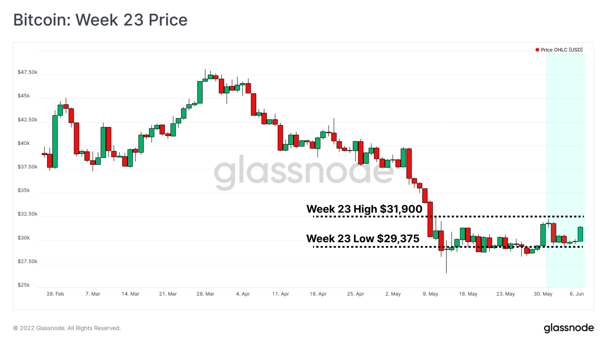 پس از گذراندن ۹ کندل هفتگی قرمز به صورت متوالی، سرانجام این هفته شاهد بسته شدن کندل هفتگی سبز رنگ بودیم. البته بازار صرفا با ۱.۵۷ درصد افزایش قیمت، رشد چندانی نداشته و این هفته تنها در محدوده ۲۹,۳۷۵ هزار دلار تا ۳۱,۹۰۰ حرکت می کرد.