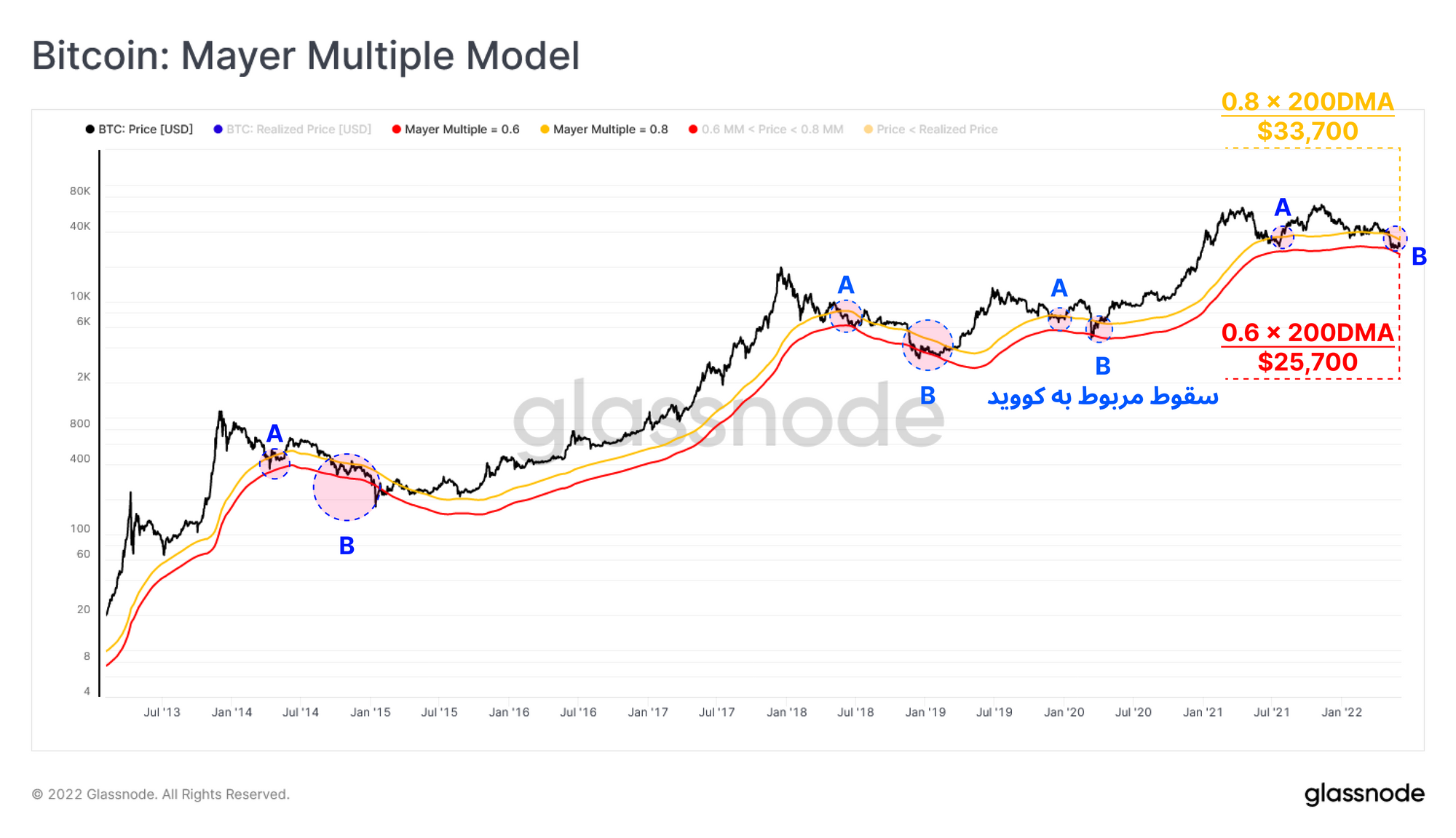 این مقادیر در Moving average دویست روز ضرب میشود تا مانند نمودار زیر نواحی که بیتکوین درآن ارزان محسوب میشود را مشخص کند.در نمودار زیر، این قیمت معادل بین Mayer Multiple با مقدار ۰.۶ و ۰.۸ قرار گرفته است.در چهار بازار خرسی اخیری که بیتکوین تا کنون تجربه کرده، قیمت در دو مرحله متفاوت وارد این ناحیه شده است: