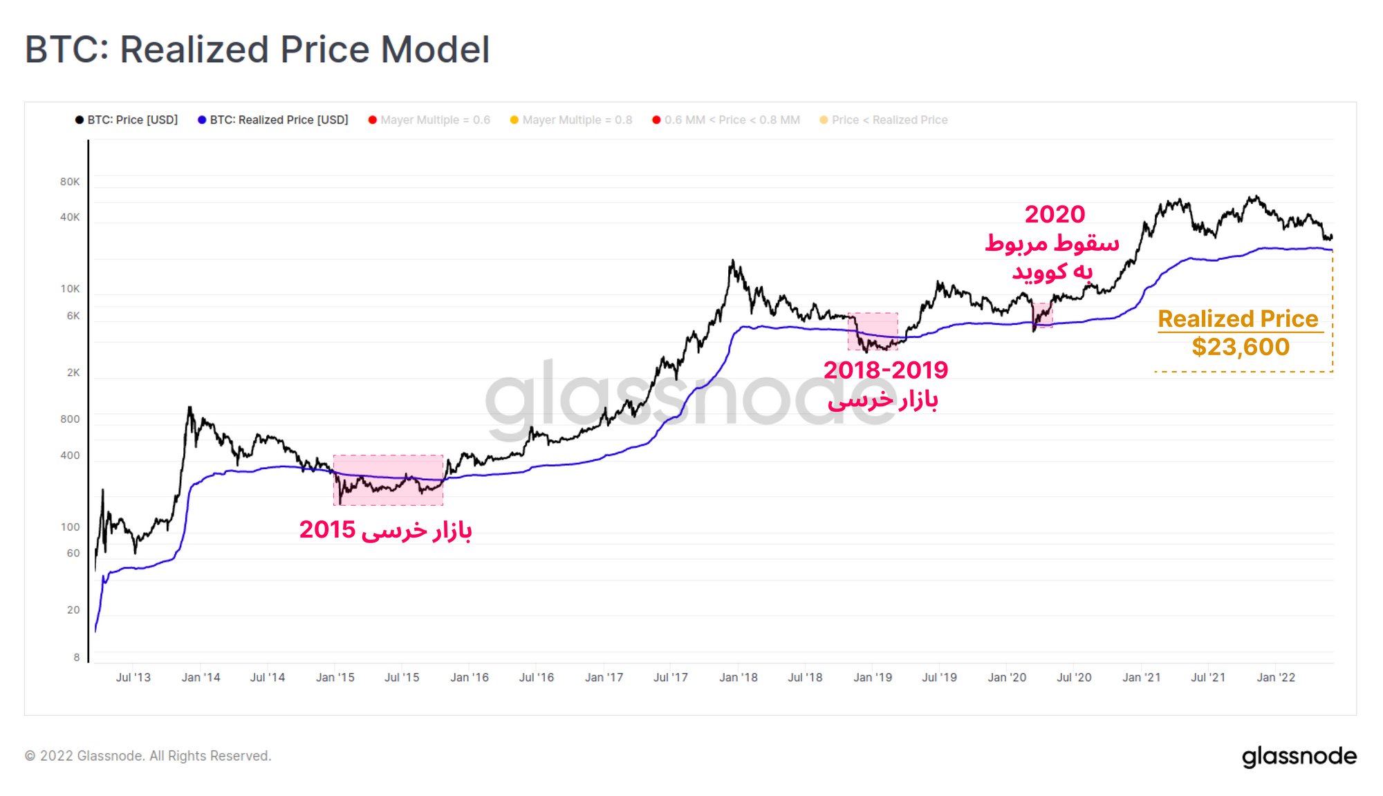 معمولا Realized Price و یا قیمت خرید کل بازار، در نقش ناحیه حمایتی بسیار قدرتمندی ظاهر شده است ، به طوری که ۸۴.۹ درصد روزهای معاملاتی بالای این ناحیه سپری شده است. به عبارتی ۱۵.۱ درصد مواقع، قیمت در زیر Realized price قرار داشته که با Mayer Multiple در مقدار ۰.۸ هماهنگ است.