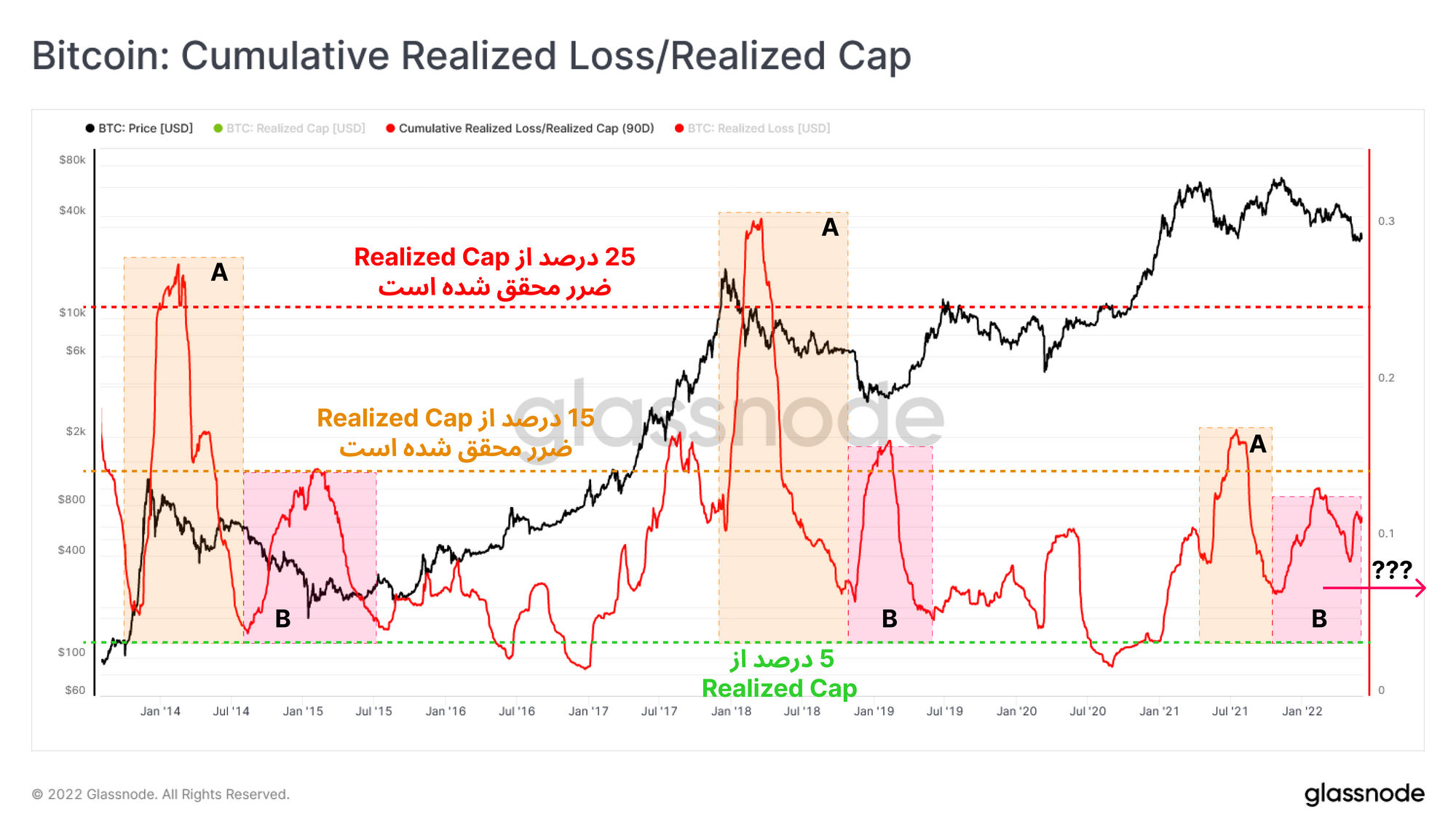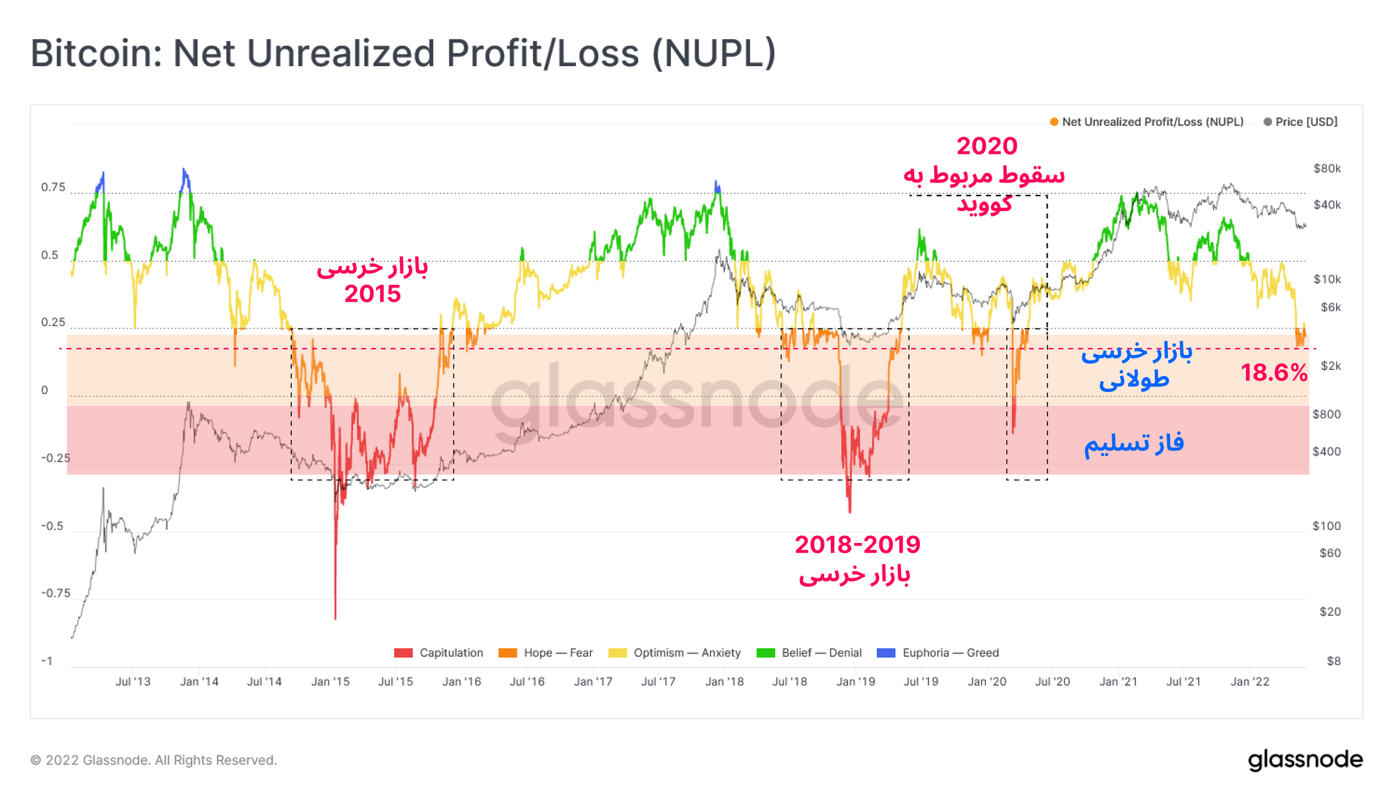 پس از سقوط قیمتی ATH ماه می تا جولای ۲۰۲۱، مرحله اول محقق شدن ضررها رخ داد. در حال حاضر بازار در مرحله دوم قرار دارد؛ زیرا احتمال تسلیم نهایی بازار افزایش پیدا میکند و سرمایهگذاران به صورت مداوم ضرر خود را محقق و یا نقد میکنند.